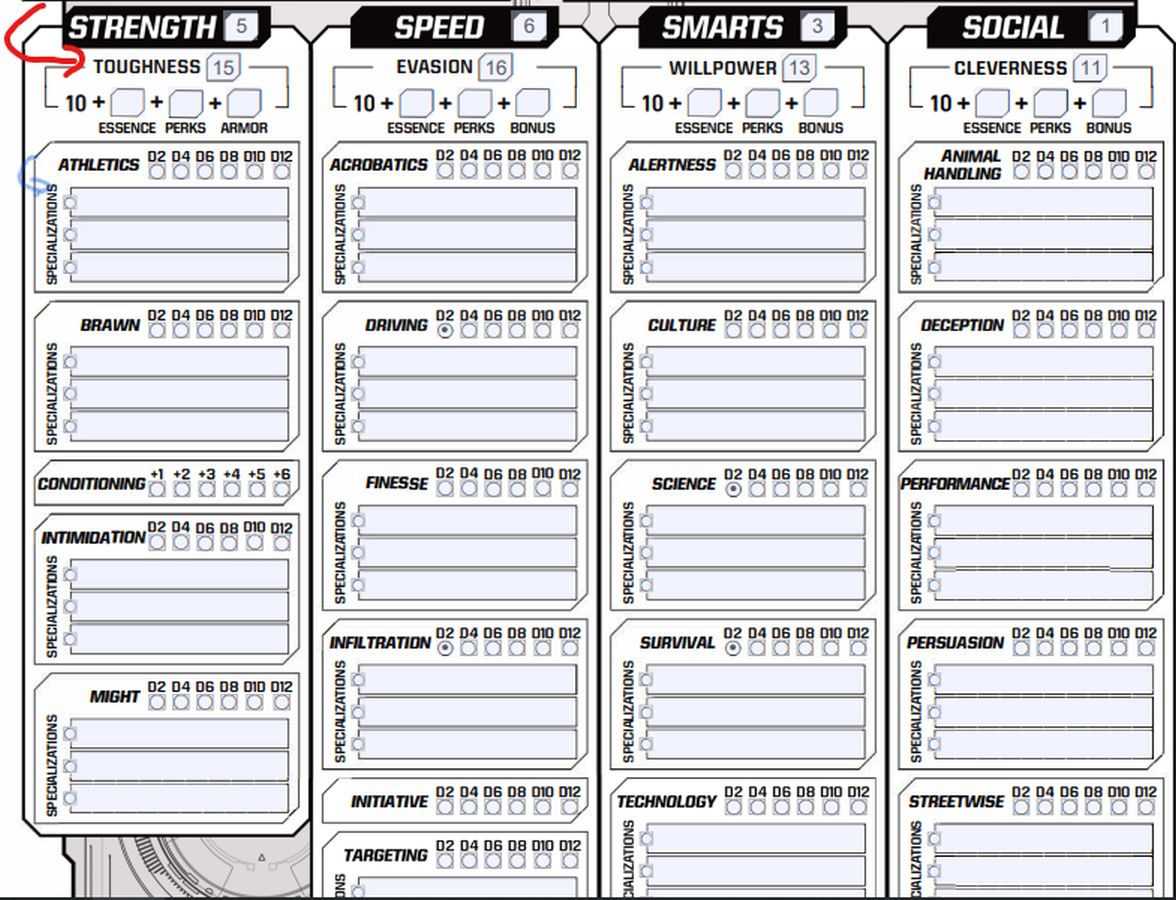 Filling in the derived stats, I marked those with the red arrow, is extremely easy. It’s 10+ whatever number you have there. I always like to do this last. The blue arrow shows you where you would put your Skill Specializations: These expand your skills and give you further control of what your character can and can’t do well. What you see here is your defense, and you always do this part last. Your defense will come into play during combat and sometimes during specific roleplaying scenes.
