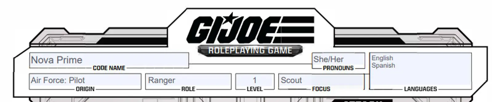 The top of the character sheet looks like what you would expect, along with space for a code name. For example, Scarlett’s code name is…Scarlett. You’ll notice that there is no spot for your character’s “real” name here.