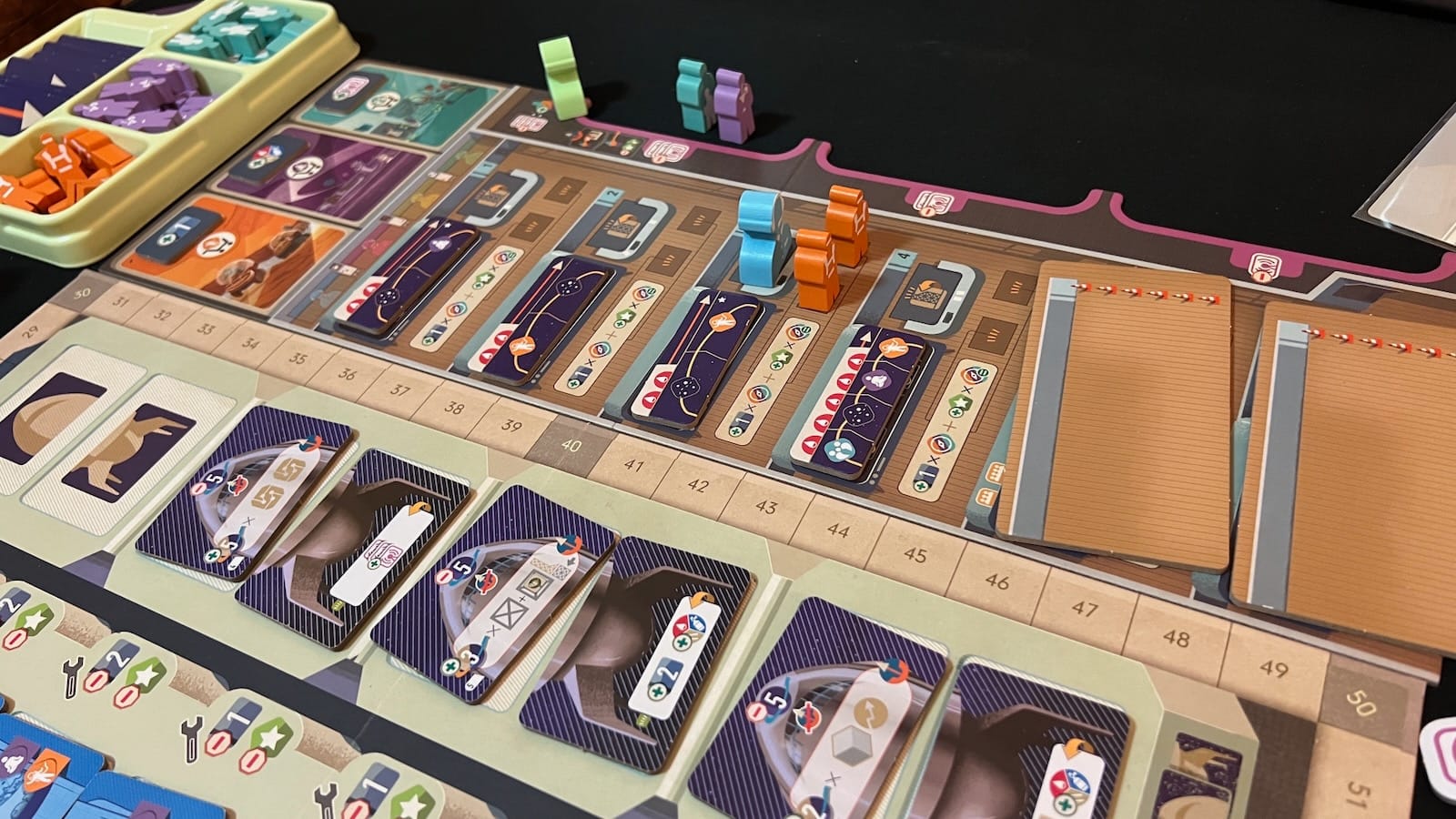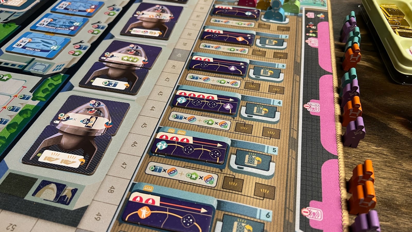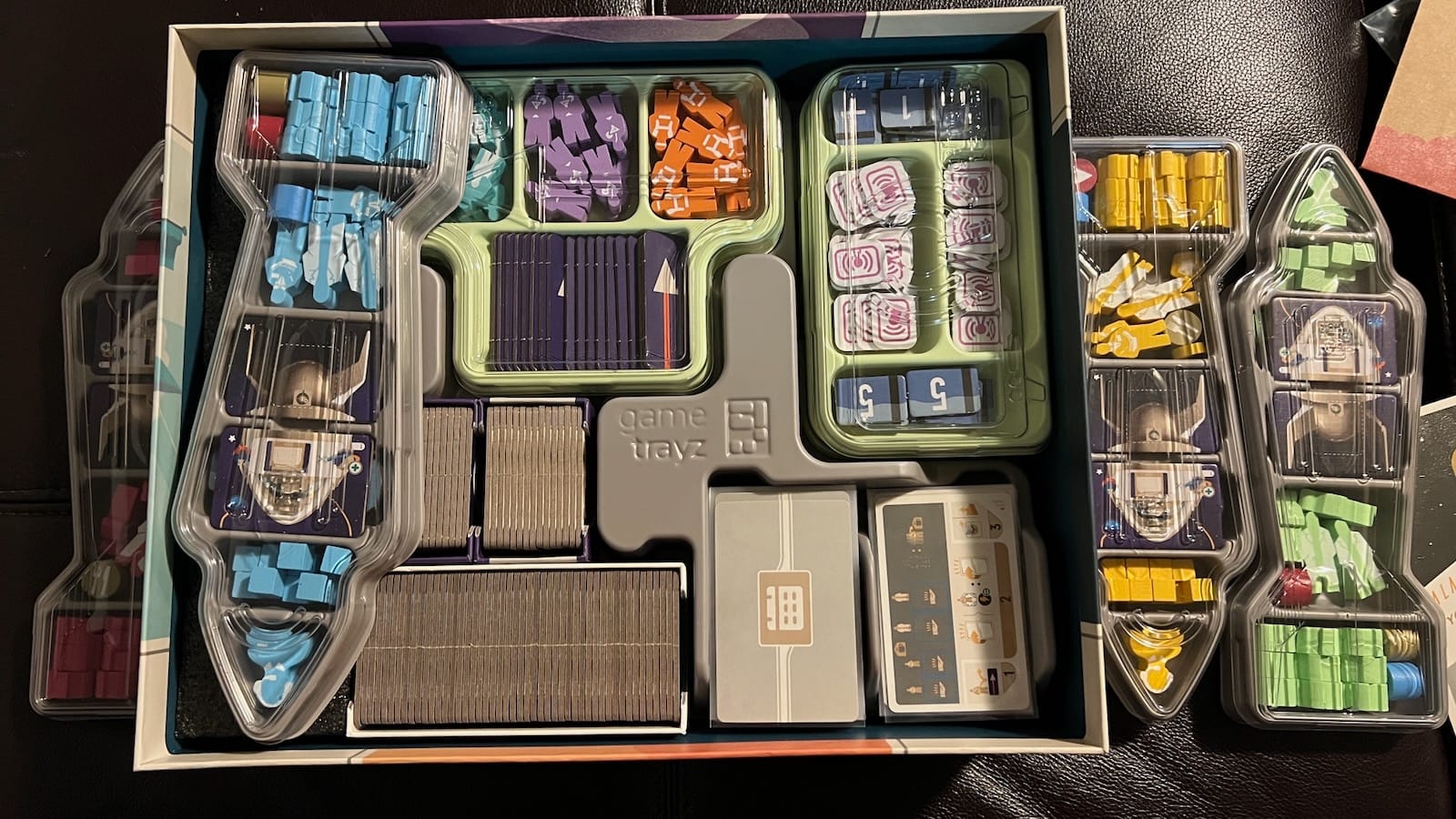 Kinson Key also had some big name partnerships on the production team. The entire game is loaded with the artwork of Ian O’Toole who illustrated everything in a mid-21st century modern Tomorrowland style. The developers also partnered with GameTrayz, whose components come standard in the base box. Each player has its own container for all the pieces they need and the passenger and itinerary tiles fit into another. Even the advertisement and money tiles get two containers of their own. Everything fits like a glove and even has room for the expansion content being released at the same time as the base game.