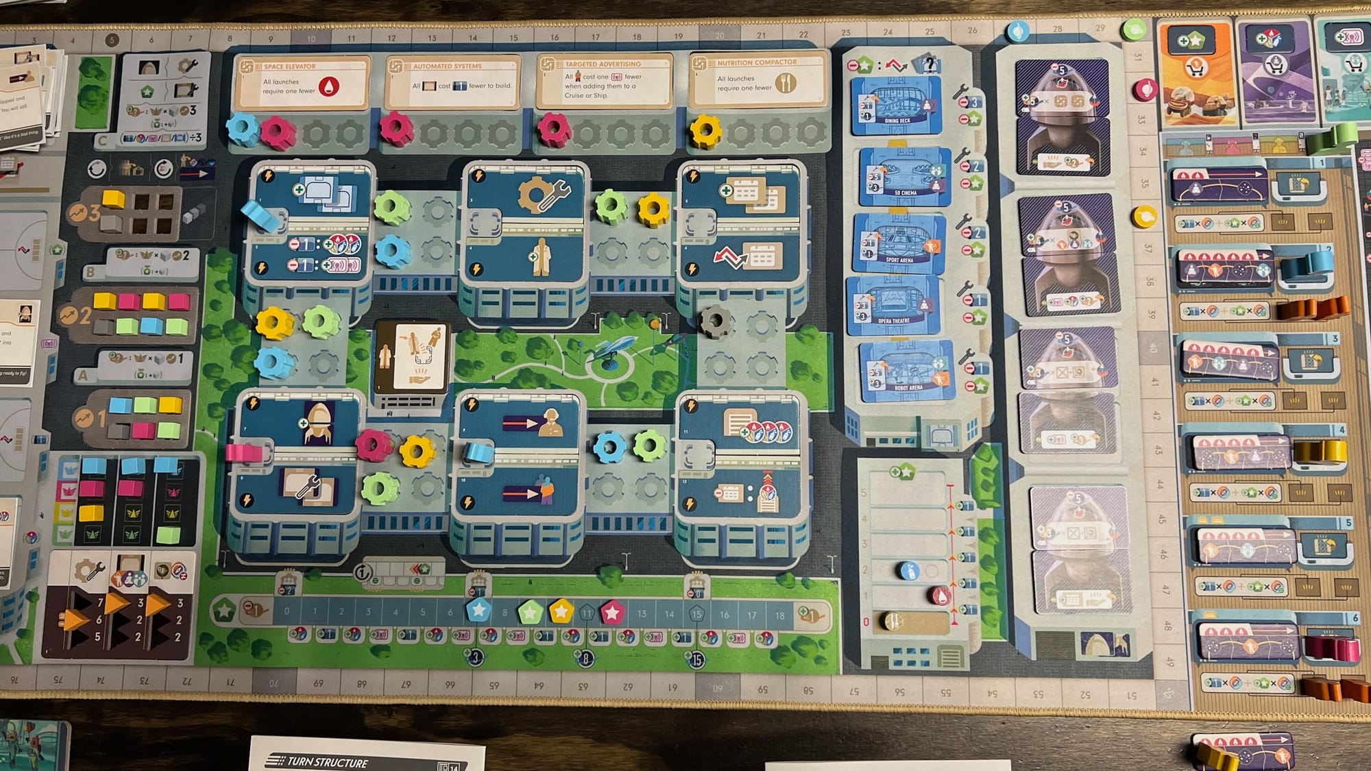 As ships launch and different in-game conditions are met, cubes of the player color are added to a display. The first two times the display is filled, a mid-game scoring round is executed. After the third display is filled, the game end is triggered. Players will get a few more opportunities to take turns and advance cruises until final scoring is tabulated. Players will score points based on their ship cockpit bonuses, printed scoring on player boards, influence tracks, and built modules, the number of leftover resources, and the cubes placed in the display. The winner becomes the new CEO of the company.