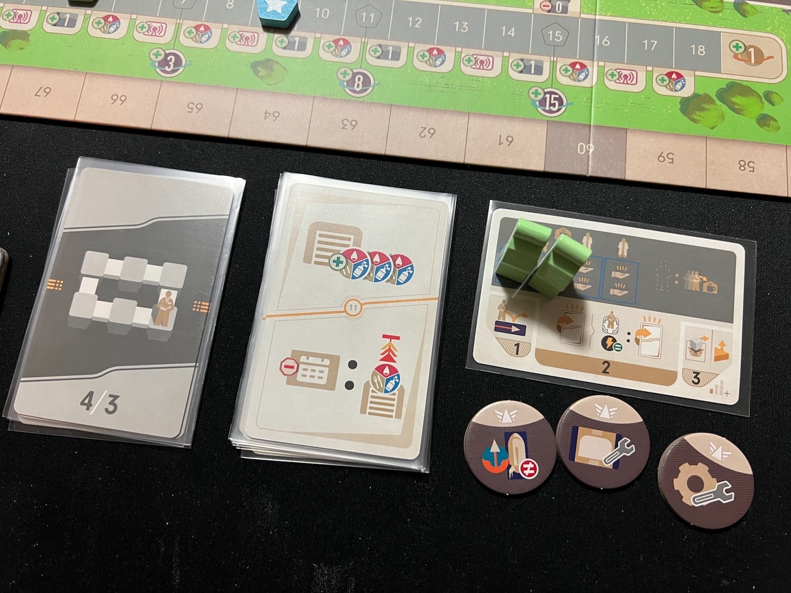 In the solo mode, you are taking on Rachel, a long lost family member who has been biding their time off planet but returned to take their rightful place at the head of the company. This opponent can be scaled to an easy, medium, or hard difficulty. Rachel has three scoring markers that are placed on different locations, depending on the difficulty which include developments built, cabins constructed, and ships launched. Rachel will also execute the actions differently depending on how tough you make her.