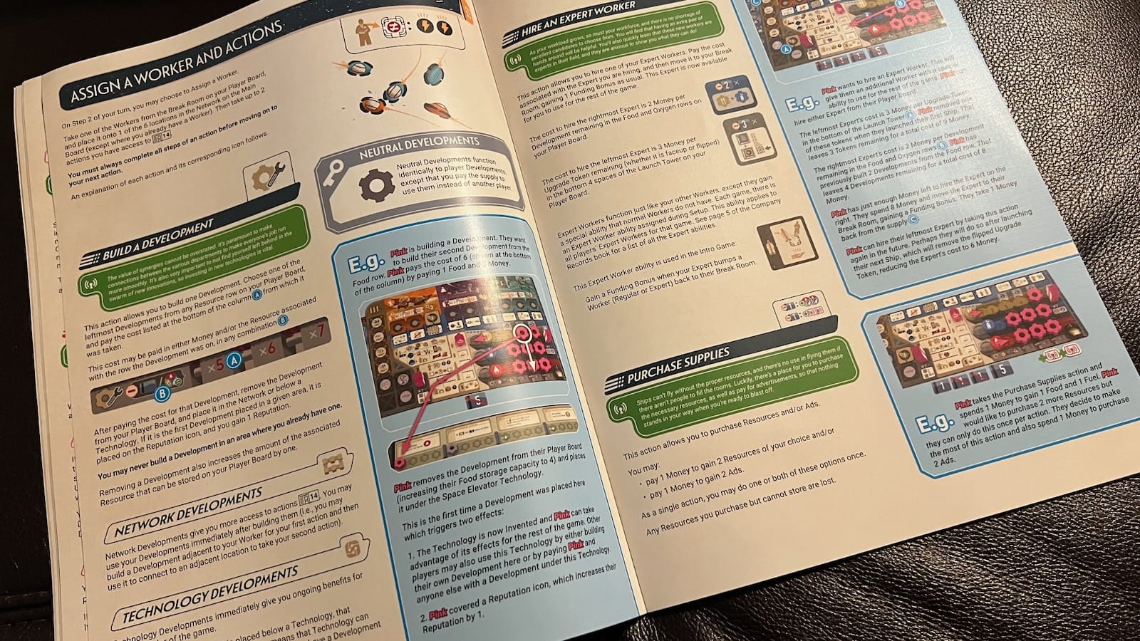 The player aids, rule book, and appendix booklet are masterpieces in user experience and design and a huge kudos goes out to Ammon Anderson who developed them. The rule book is easy to read and flows nicely. Each section has a fleshed out example to go with it and references to other pages when referencing other content. The creators also knew that players would love the game enough and added the expansion rules to the main rulebook. The Player Aid booklets feature the information most useful to players such as actions, scoring goals, and everything they need to execute a turn or a launch. The player aid also features references to page numbers in the player manual throughout. The Company Records appendix book adds a few more references, some game variants, and even space to add future expansion content.