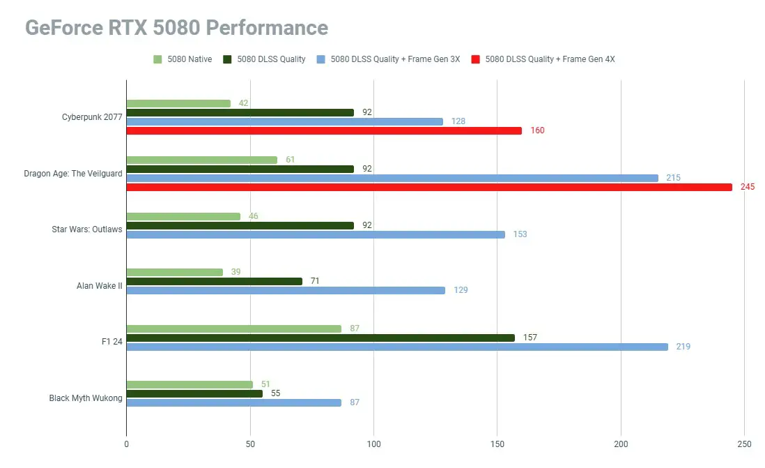 75 games will support DLSS 4 on day one, including Alan Wake II, Dragon Age: The Veilguard, Stalker 2, Diablo IV, God of War: Ragnarök, Cyberpunk 2077, Marvel Rivals, Hogwarts: Legacy, Deep Rock Galactic, Still Wakes the Deep, Remnant II, Indiana Jones and the Great Circle, Senua’s Saga: Hellblade II, Icarus, Hitman: World of Assassination, The Thaumaturge, Deliver Us Mars, The Finals, Star Wars: Outlaws, and much more. Put simply — it’s the most bleeding edge games we’re all playing, not something from the back catalog. You’ll see in our benchmarks that not all of these games have 4X available yet, so we’ll revisit these graphs when those patches arrive.