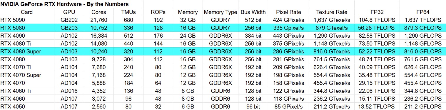 As you can see, the 4080 Super is the closest numerical equivalent to the RTX 5080, in terms of fill rate, memory, and more, but that doesn’t tell the whole story. The shift to GDDR7, the next generation of all of these chips, and the various capabilities of the card beyond just pure graphical power are certainly a factor.