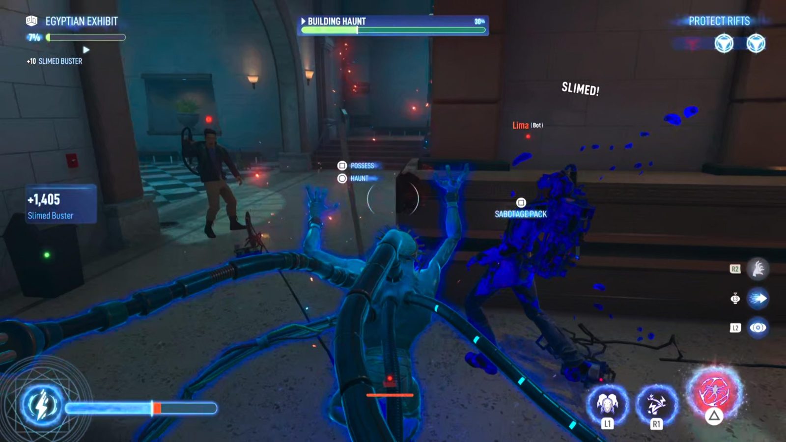 While the customization for ghosts begins and ends with color swaps, there are a fair variety of ghosts to play as with various abilities. There are five main varieties of ghosts to choose from, each with their own subcategories that offer a spin on their abilities. The Basher ghosts, for example, benefit from increased damage to objects and suffer a shorter stun duration, while the Ectoplasts have bonuses to their slime and evasion. Within these groups, there are usually three or four variants to play as, keeping the same ultimate move and minion spawns but having their own unique ability. These abilities are usually similar across each class of ghost with a slight twist, with one offering an area of effect attack, another a ranged projectile, and one with a short burst effect. However there are some abilities that break this trend, with more nuanced abilities such as a silencing shroud that prevents communication. Experimenting with different ways of causing chaos is great, and while the variety may not be too expansive, the ghosts still feel different enough thanks to the passive effects each class carries with them.