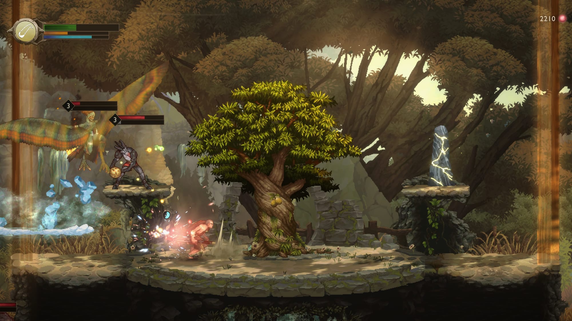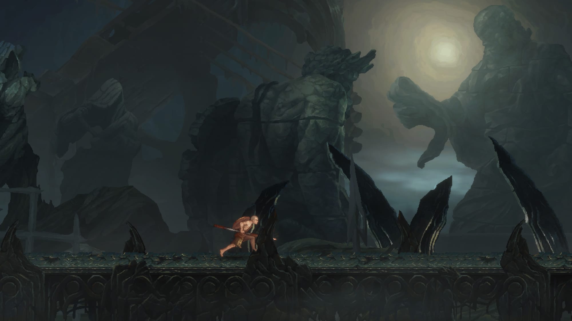 Speaking of gameplay, this grows more steadily than the story does. As with most Metroidvanias, the side-scrolling action will have you running, jumping, and fighting (with a spear and shield) through each frame. Platforming feels excellent, especially as you earn new abilities. You'll travel to one area, find out you can't progress, and go somewhere else to find the tools to advance past your obstacle. Thankfully, it comes across as organic for the most part, a natural progression where you aren't just hunting McGuffins.