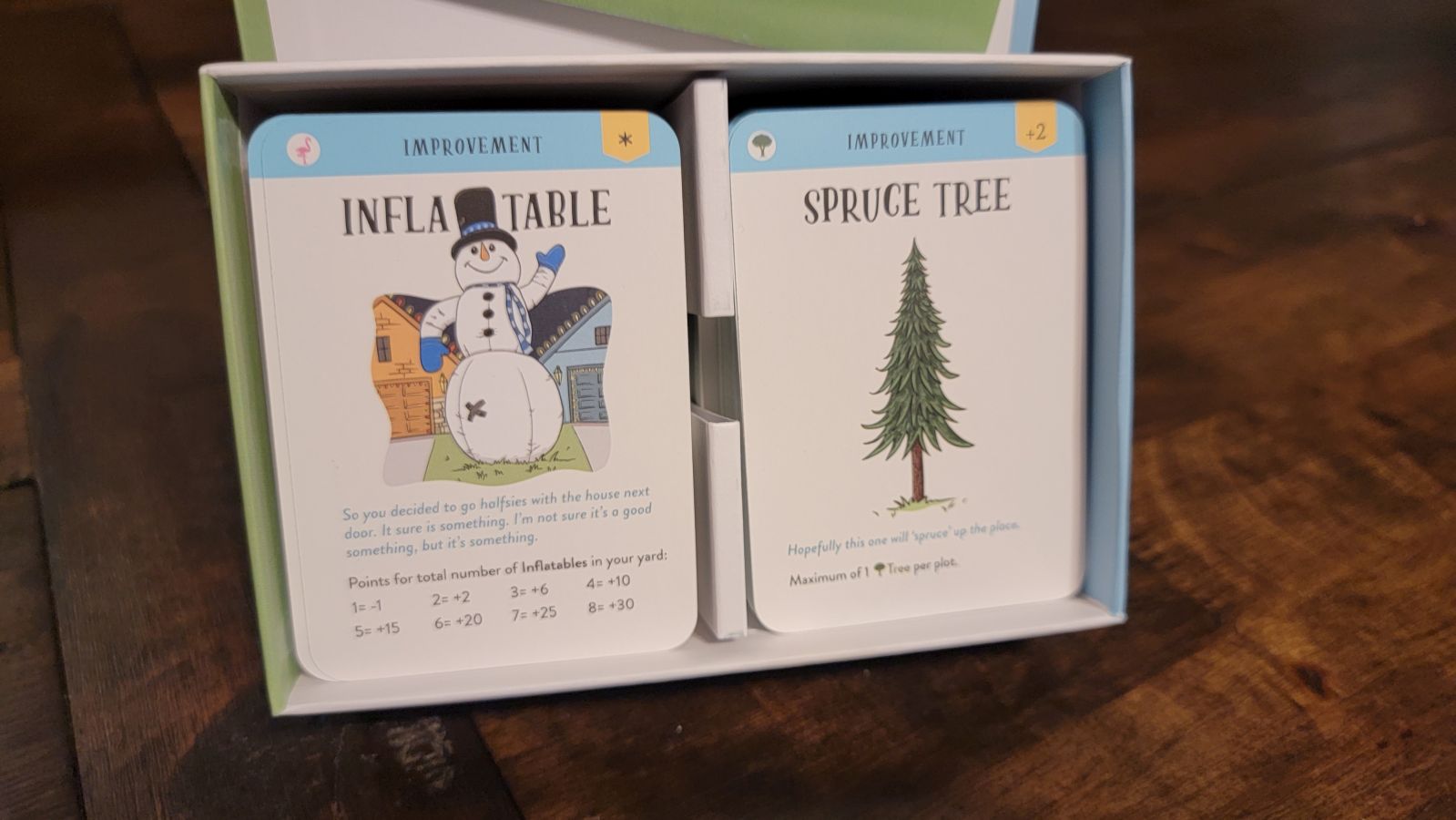 The three land plots serve as the playing field, with each of the three plots able to be filled with a maximum of three plot elements, be it an improvement or an impairment. Improvements enhance the yard and grant points, while impairments are often placed on your yard by other players to devalue your yard. Once placed, both improvements and impairments are permanent aside from drawing a card that allows you to remove it. Further adding to the complexity is card subtypes, which grant bonuses when you use specific cards together – say using a tree improvement and a bird house improvement – or grant additional points based on an HOA member’s likes, such as an HOA member who likes improvements which fall under the “tacky” category.