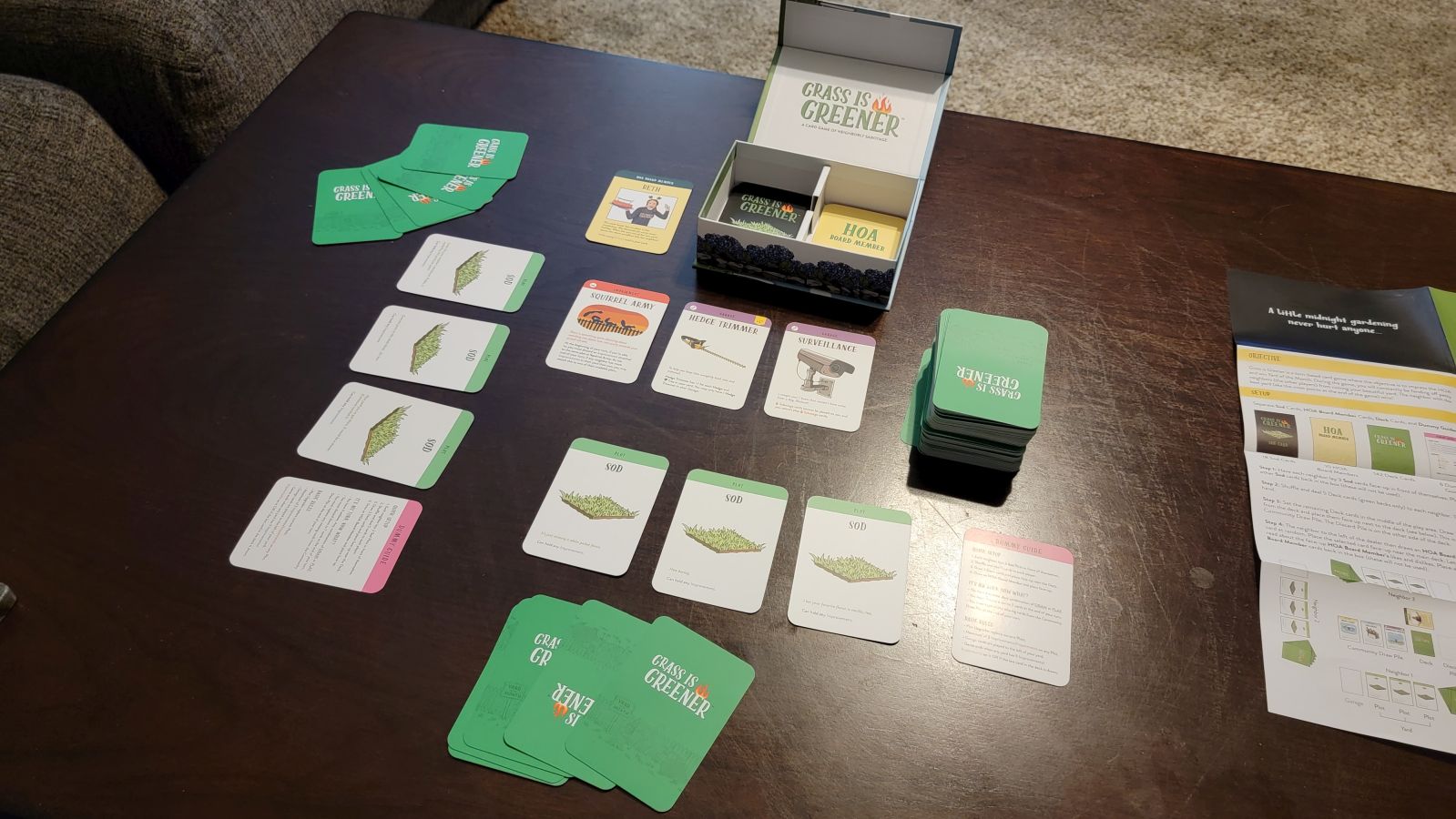 Grass is Greener is a fast-paced card game where two to four players compete to win the coveted Yard of the Month crown from their local HOA. The premise is simple: to win you must sabotage your neighbors’ yards while simultaneously enhancing yours, all while catering your new yard decor to suit HOA member’s tastes. Grass is Greener is often funny and sports just enough strategic elements to prevent playthroughs from becoming stale, creating a fun night of pitting friends against each other in not-so-friendly competition.