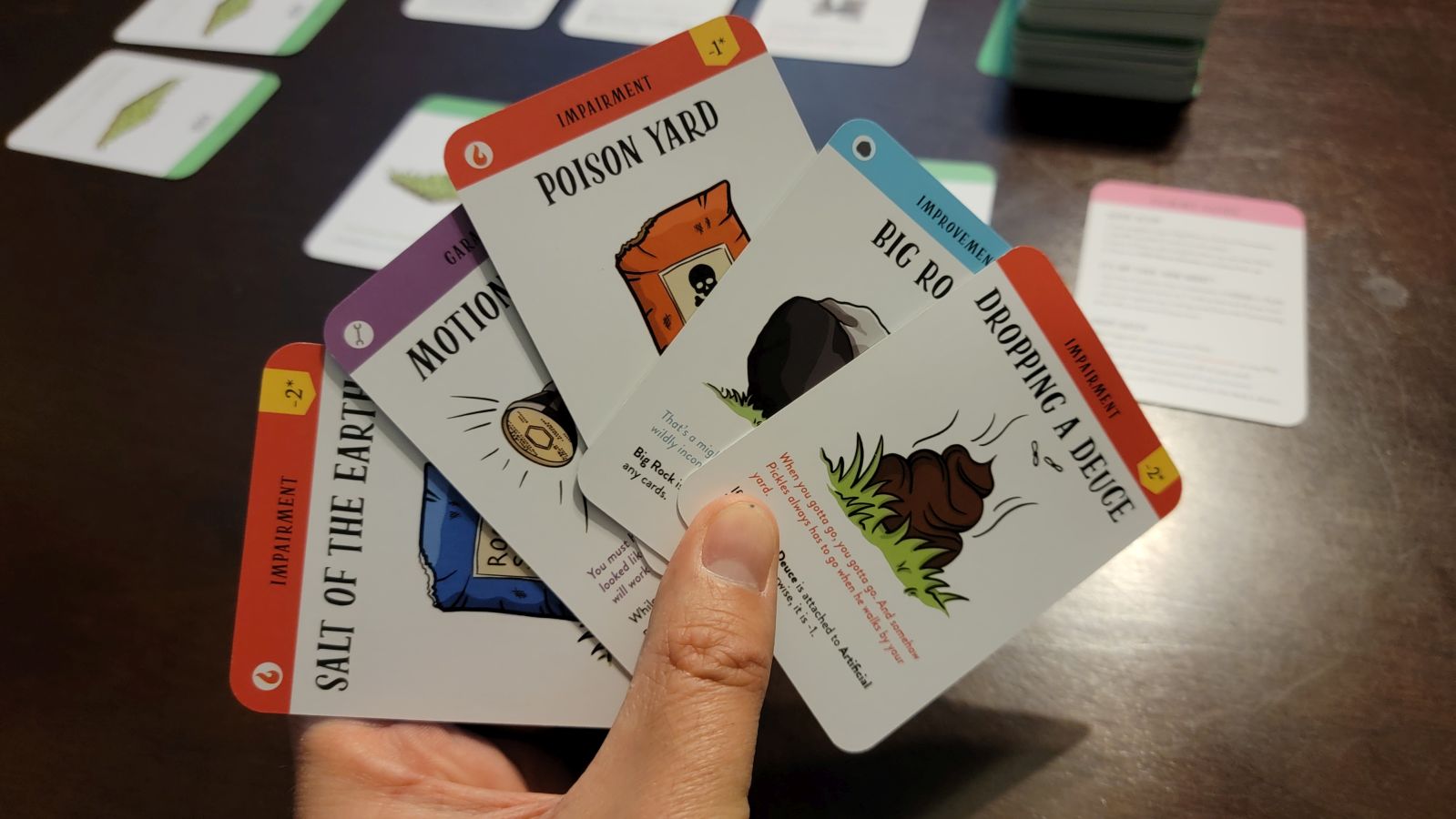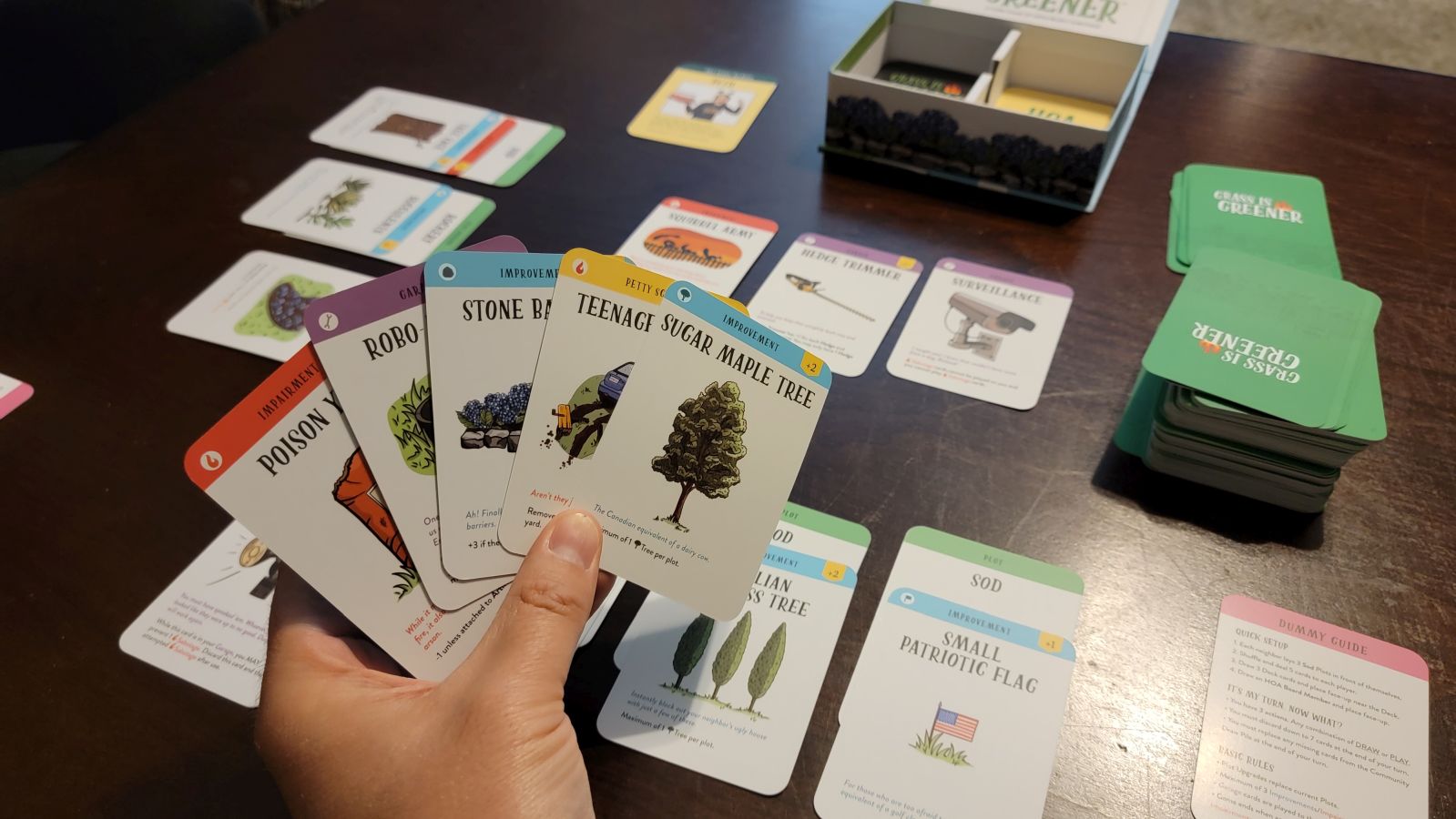 During each turn, a player can either draw a card or play a card in their hand, but each player must perform three actions. If a player chooses to draw a card, then they can either take a card from the community deck or take the card from the top of the main deck. Players cannot hold more than 7 cards at a time. If a player chooses to play a card, then they will choose a card from their deck and complete the selected action that the card details. This may be an improvement to place on one of their three plots, an impairment to place on a neighbor’s plot, or a petty scheme, which allows them to perform hurtful acts on their neighbors, such as taking a neighbor’s entire hand or removing all improvements on one of the neighbor’s land plots. Additional cards include plot upgrades which allows you to switch your plain sod plot to artificial turf or a mulch bed and garage cards which grant bonuses such as preventing a neighbor from placing an impairment on your yard.