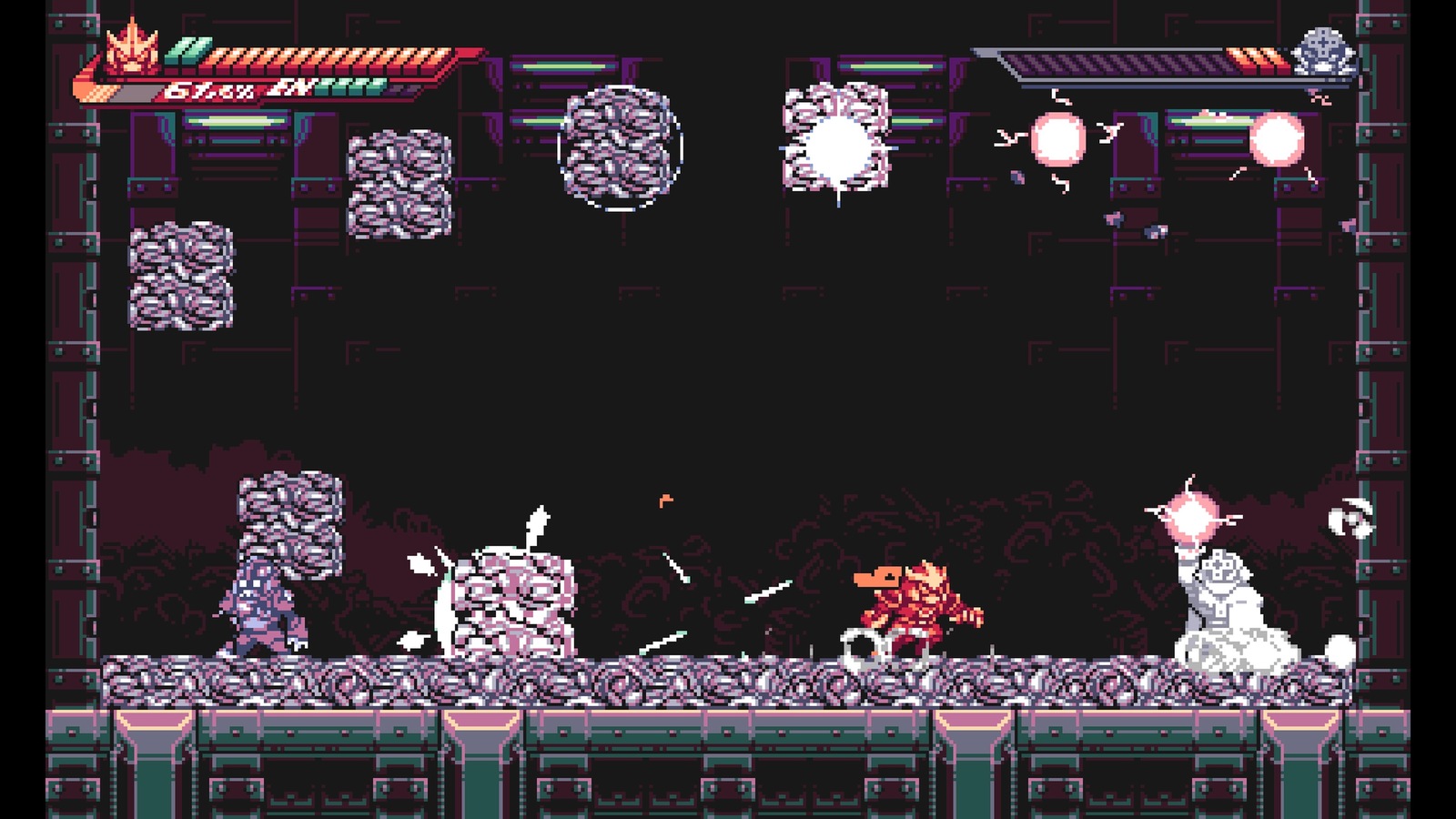 While Gravity Circuit adopts the Mega Man premise wholeheartedly, it executes on the details distinctly. All of your extra abilities are completely optional and don’t rely on preying on your enemy’s weaknesses. The melee focus separates itself from Mega Man’s blaster or even melee-focused Mega Man characters like Zero. Gravity Circuit’s protagonist lands his blows with a snappiness that allows him to quickly weave in and out of danger. His grappling hook acts as a driving force for interesting approaches – you’re constantly thinking about how you avoid enemies or use your foes as resources.