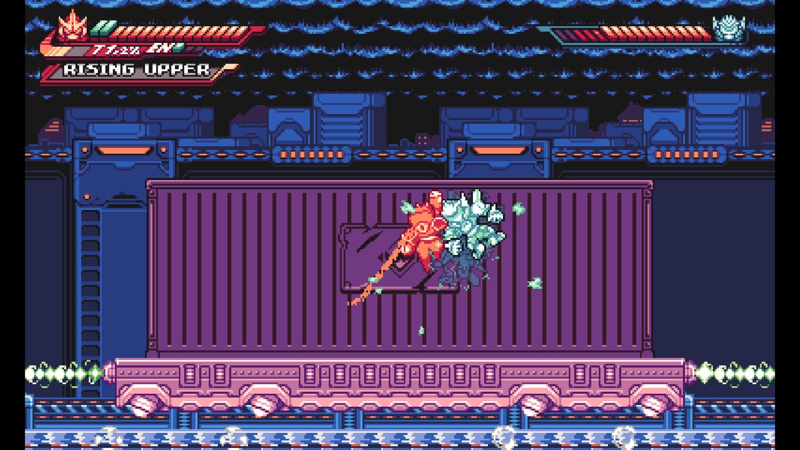 Admittedly, the wailing is excellent. Although Gravity Circuit never truly leaves its platformer roots, the presentation of its combat mimics the best of arcade fighters and beat-em-ups. Every attack in Gravity Circuit effectively sells the strength and intensity with crunchy sounds and animations. Beating on enemies provides a consistent source of joy.