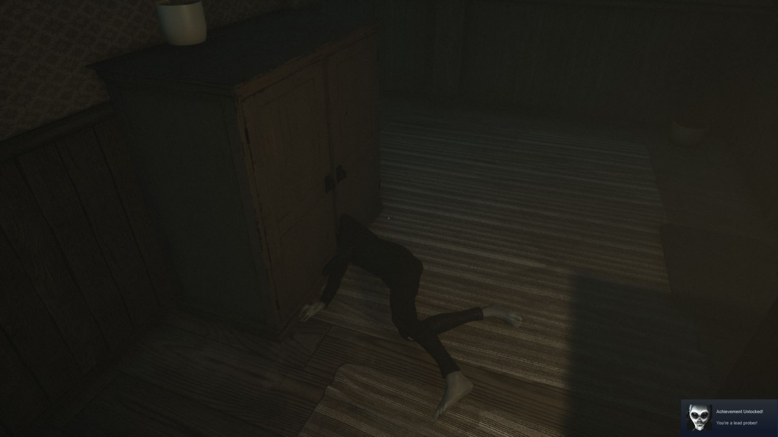 On the other hand, killing an alien with the revolver is effective, but bullets are rare, and the noise can attract other greys. Killing aliens isn’t satisfying outside of the catharsis of being rid of another tiny grey stalker. There’s no blood, no impact, they just fall over. The first time I encountered an alien, I killed it, it fell over unceremoniously, and clipped into a cupboard.