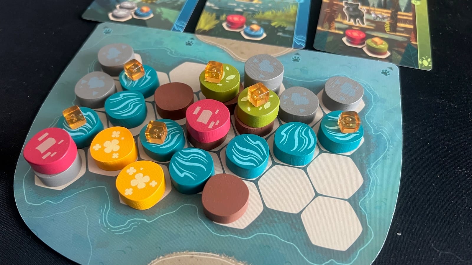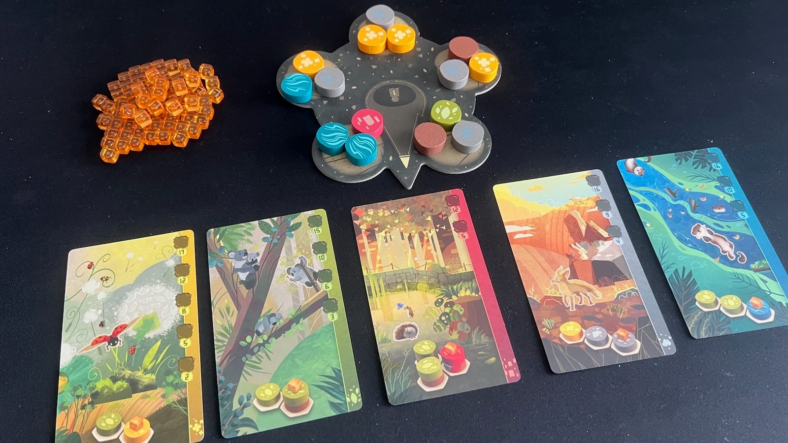 The production of the game is also fantastic. The smaller sized box has a built-in organizer to house the cubes and cards and the cloth bag easily fits all the tiles for the game. The tiles themselves are thick and colorful wood and are screen printed on both sides with symbols denoting the type in case of color-blindness. The artwork throughout the game, created by Maëva Da Silva, is whimsical and colorful and draws you into each scene. Each card is a miniature work of art and it’s fun to see a new and playful animal come out in the tableau.