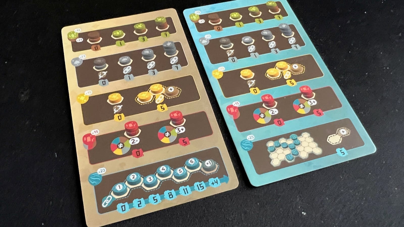 After each player’s turn, the missing tiles and cards are replenished and play continues clockwise around the table. When the bag holding the tiles is empty or a player board only has two empty spaces remaining, the current round is finished and players score their boards.