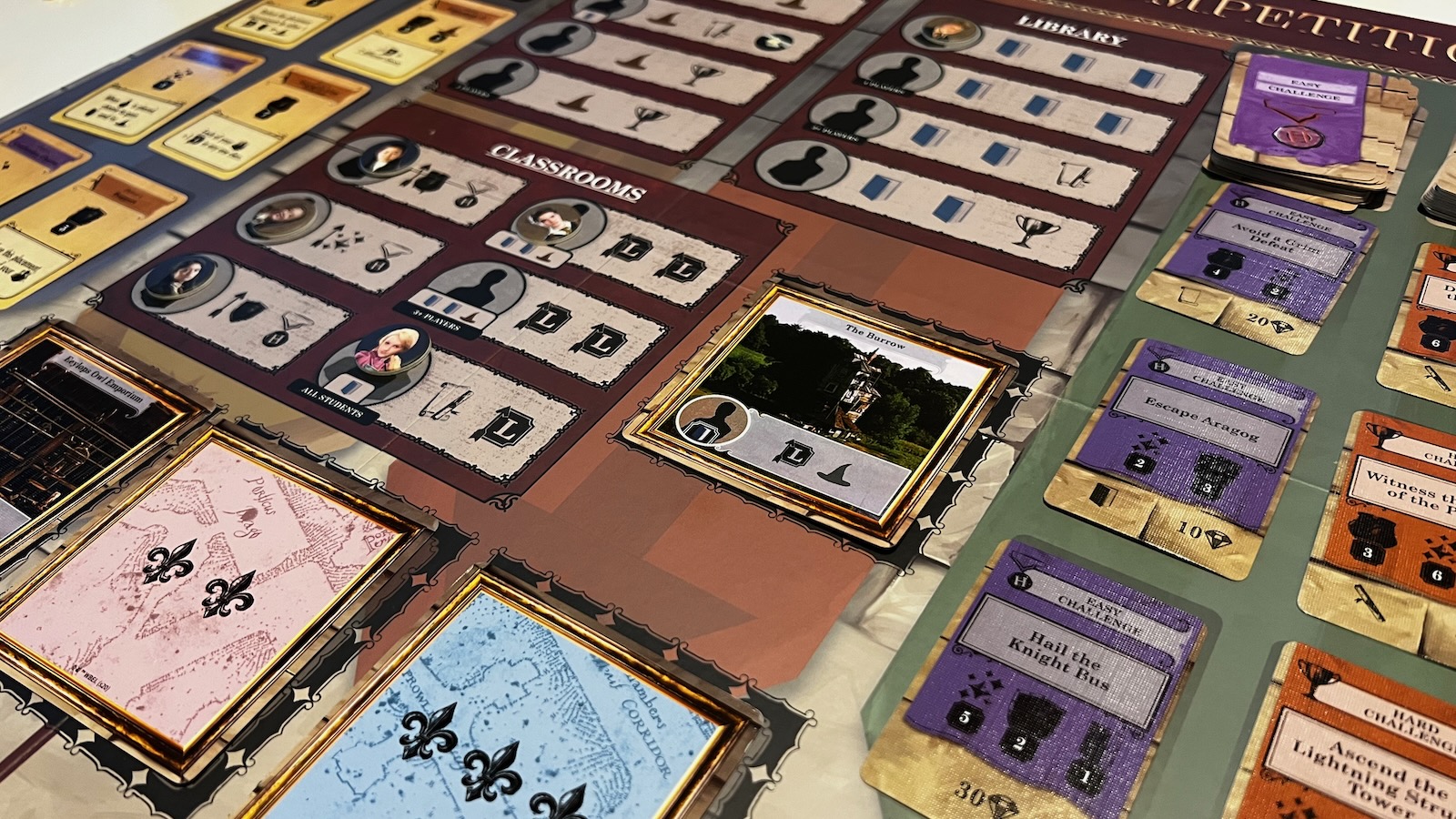The main board is where most of the action takes place. Players alternate to send students to different classrooms and special locations on the board. In the Professor’s Office, students can gain magic, the Library is used to pick up knowledge, and the classrooms allow the students to advance on their attribute tracks. The board also houses a special starter location with more advanced locations revealed throughout the course of the game, giving players more options. The sides of the board house basic and advanced lessons and challenges. At any point during a player turn, players can use lessons to advance attributes and gain resources needed to take another action on the board. After each player has placed their students, the challenge phase begins. Players can assign their students and their attributes to basic and advanced challenges, combining their talents to earn points.