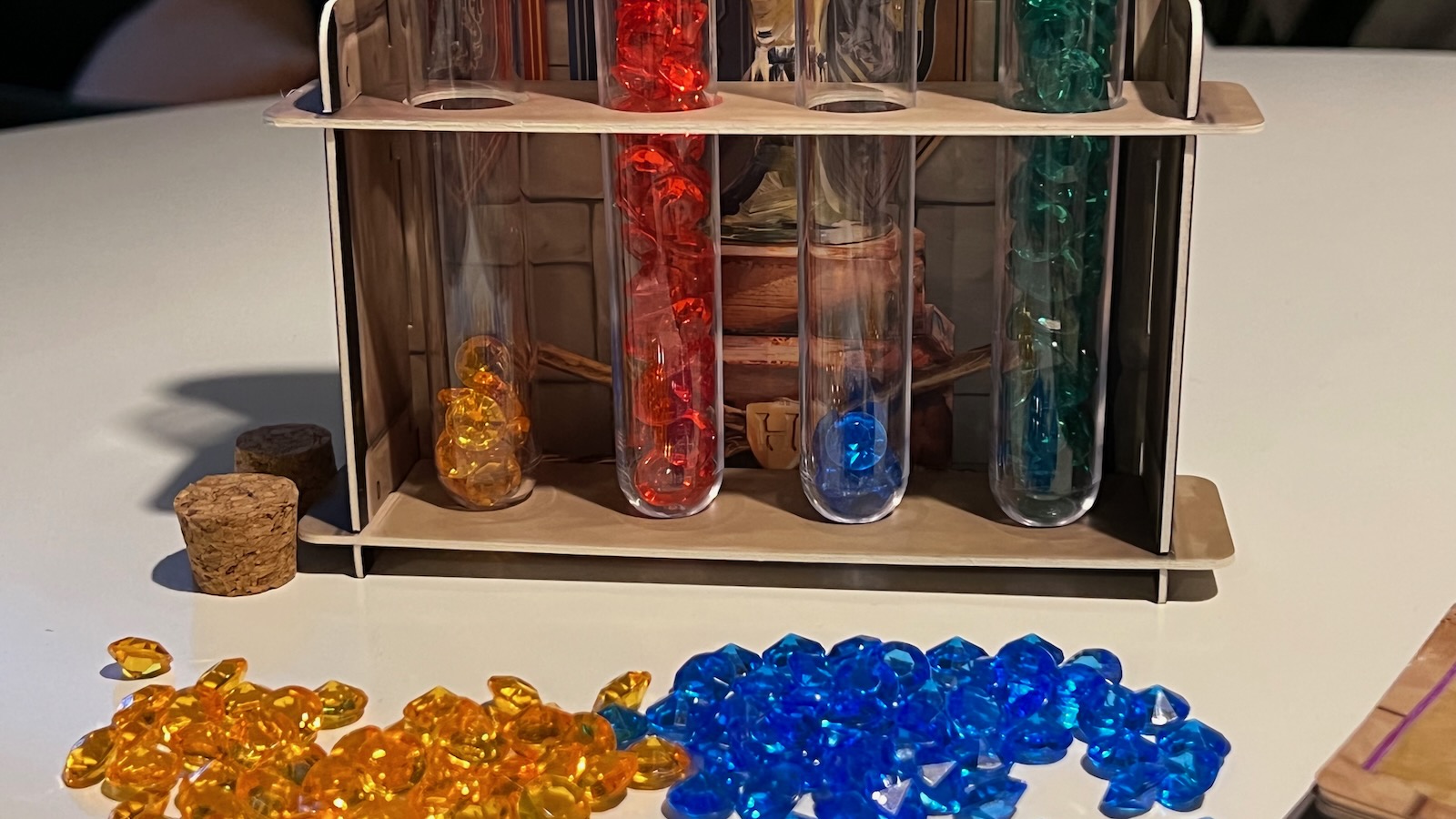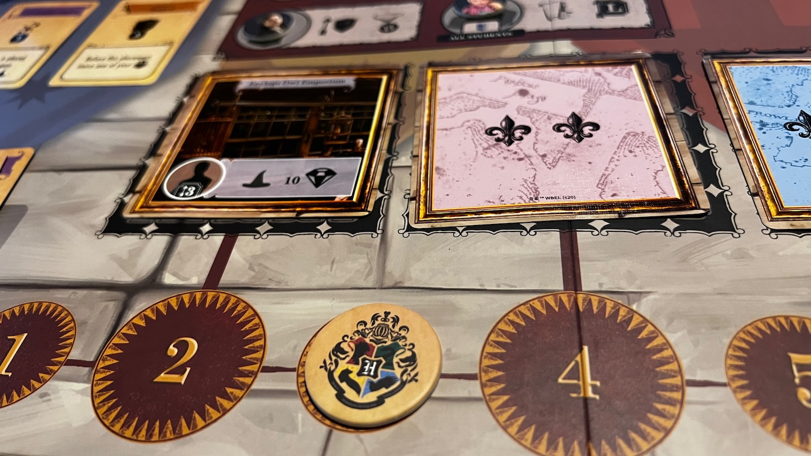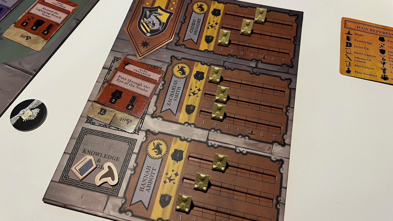 The components of the game are a mixed bag. The cards are made of flimsy paper and are easily bent. Some of the iconography is difficult to distinguish from others. More than once did the players at the table confuse Defense Against the Dark Arts shield symbols with the Potion cauldron symbols. Also the markers for each student are small cardboard discs with images of actors from the movies. The dual layered player boards are well made and use plastic sliders to mark the student attributes. The knowledge and magic resource tokens are also made of a quality cardboard and feel good in the hand. The best components are the point trackers and the display. Each house is marked by gems of the house color. When you score ten points in the game, you place a gem in the display tube and watch your fortunes rise. Overall, the game looks great on the table and really captures the essence of Hogwarts castle. The colors are vibrant and the different places to send students are clearly marked.