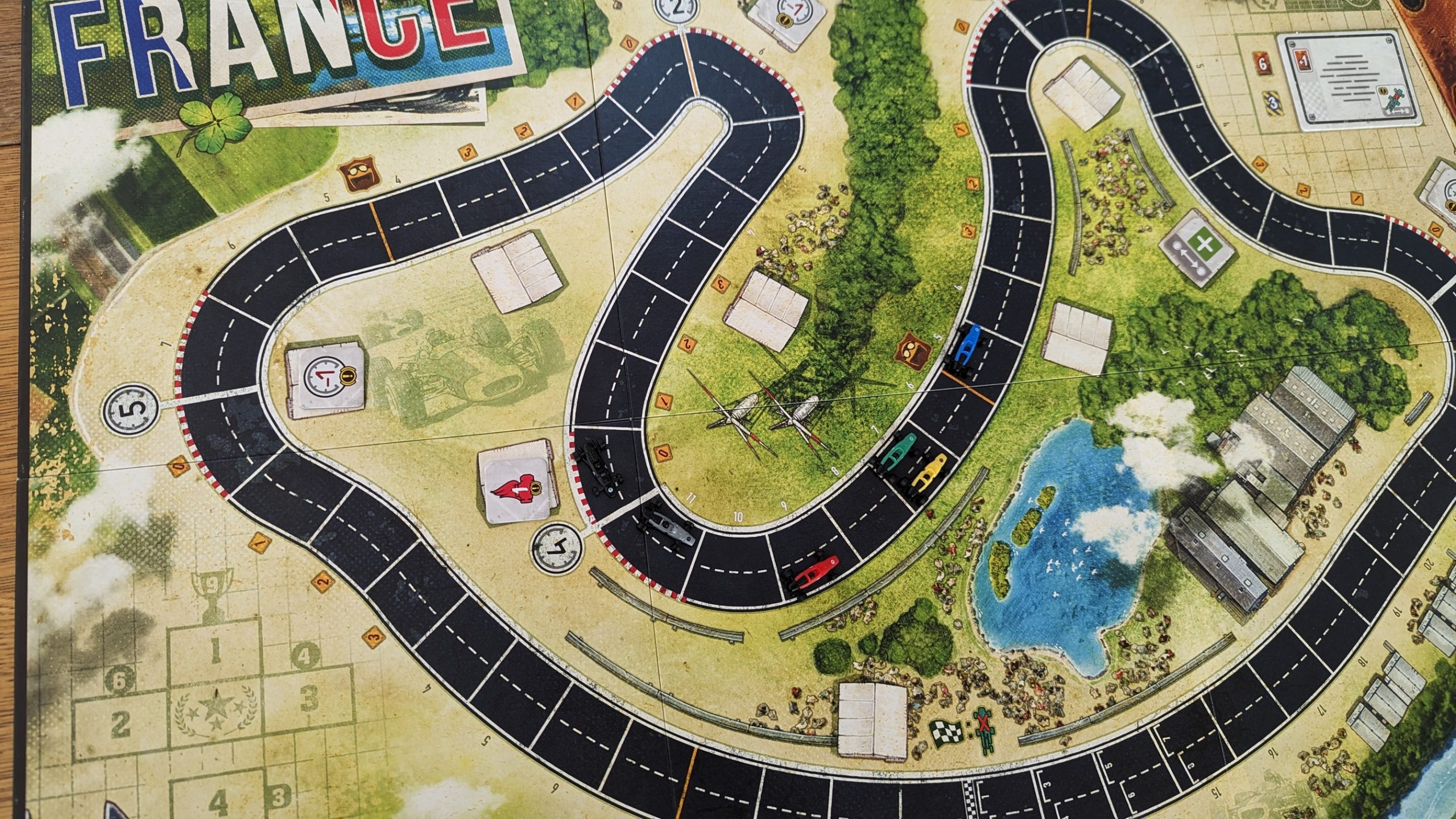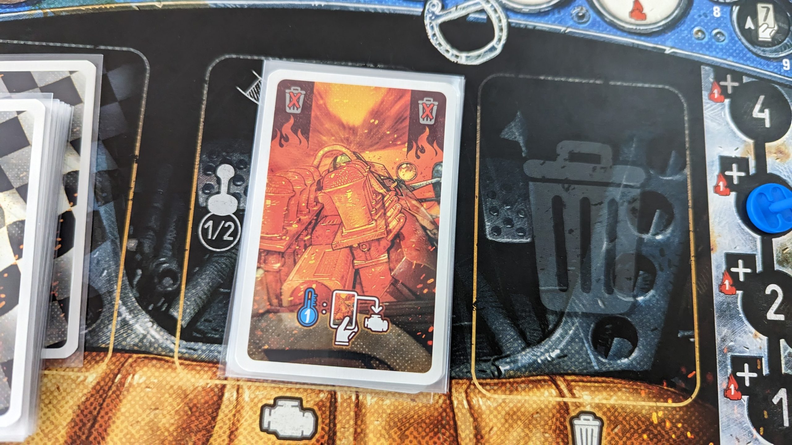 Now that I’ve got that out of the way, let’s dive into the actual gameplay. Every round starts with players shifting into gear 1-4, which indicates how many cards they’re going to play from their hand. Once everyone’s picked their cards, they go their turns, starting with the player in the lead. The total value of cards played is how many spaces you move, simple enough. If a player doesn’t like where they would wind up, they can choose to boost by paying a heat from their engine to their discard to flip cards from the top of their deck till they hit a speed card which is added to their total movement, with all other revealed cards tossed into their discard. At the end of movement, if a player is directly behind or adjacent to another car, they can move an extra two spaces due to slipstreaming. After all movement cards are resolved, the active player can discard any cards they don’t like from their hand before drawing back up to seven for the next round. So far, what I’ve described isn’t really enough to be a game, but that’s where corners, stress, and cooling come into play. Littered throughout each of the four courses are corners, each with a speed limit. When you cross the line for a corner, you check your movement for the round, sans slipstreaming, and pay the difference in heat out of your engine if you went over. If you don’t have enough heat, you spin out, which is not worth going into the details of, but suffice to say, your chances of winning plummet if you spin out in a corner. Stress is a special pain in the ass added to your deck at the beginning of the game that can’t be discarded from your hand at the end of turn, so they’ll clog up your hand until you play them. Stress doesn’t have a value, instead every stress card is resolved by flipping cards off the top of your deck in the same fashion as a boost. While this does mean that you don’t know how fast you’ll be going, a dangerous situation if you’re approaching a corner, it also lets you skirt upcoming stress and heat cards from your deck straight to your discard, keeping you in control and leaving your options open. Heat cards work similar to stress in that they can’t be discarded, but they additionally can’t be played, meaning that if they aren’t dealt with, your hand can easily become flooded with heat. Eventually, you’ll need to throw yourself into first or second gear to get some cooling done, so you can drop the appropriate number of heat cards in your hand into your engine. In totality, you wind up with what is undeniably a racing game, but once you lift the hood, you find a system that’s all about finding the right moments. The spot where you can drop into first gear and fill your engine up with heat, or the right time where you can afford to abandon the advantages of slipstreaming and pull away from the pack.