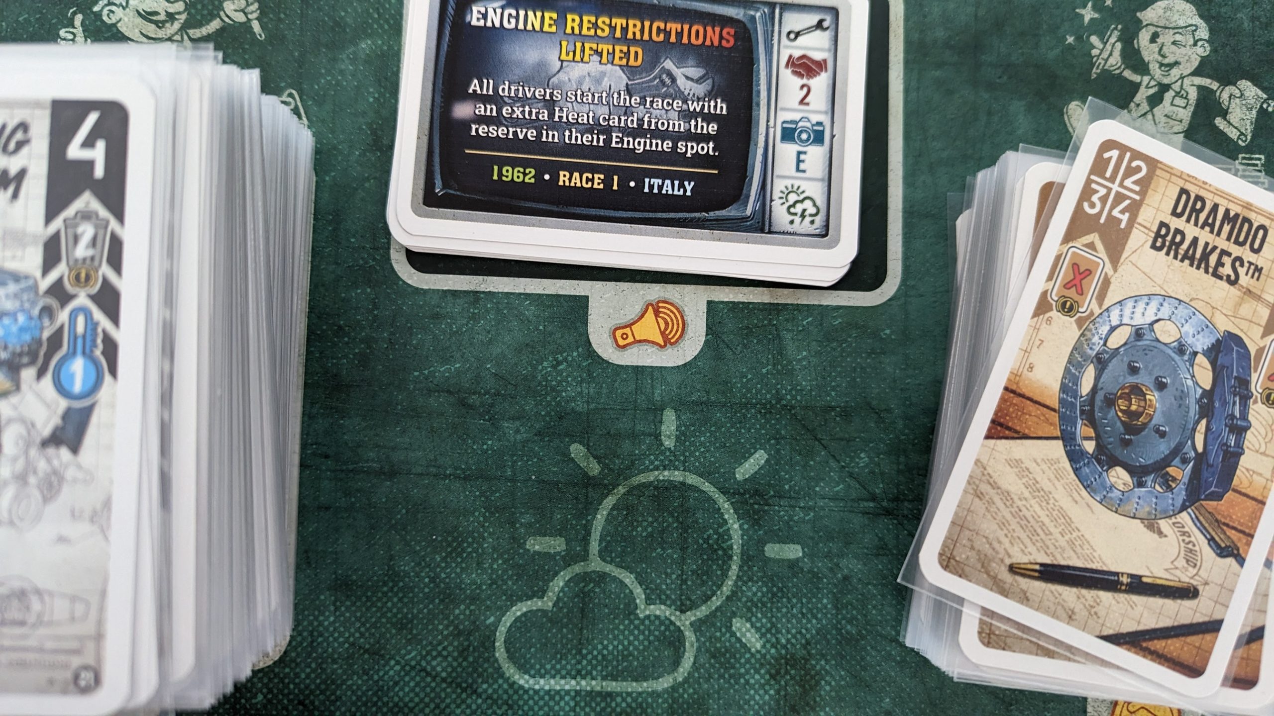 Which means yeah, the base experience of Heat is pretty good, but let me tell you about the cherry on top known as modules. The weather module is understated, simply modifying your starting heat and stress, along with tweaking some corners and fussing with some straightaways, but it dramatically changes how courses are played. After a couple races in Britain, I knew that the trick was properly managing your heat and discarding otherwise great speed cards so you can take the double corner in one turn. Do that for two laps, and you’ve guaranteed that you’re going to demolish anyone who hasn’t. But then I tossed in weather, which lowered the speed and then added the heat punishment for both of the involved corners, and suddenly the course I had figured out was unknown again. The garage module adds a miniature draft of upgrade cards to the beginning of the game. Body cards let you discard stress cards, allowing you to ignore the randomness inherent in playing them. Cooling systems let you cool without having to drop into a low gear, and extra heat is just that-nothing too splashy, but just one more of that all-important resource can mean the difference between skipping a gear to go straight into fourth out of a corner and being stuck in second. The garage deck is huge, so I’m not going to explain every card, but in essence, you wind up with a deck that feels uniquely yours, allowing you to play to your strengths while shoring up your weaknesses. Legends is just alright, a deck of cards that will run dummy cars if you don’t have the ideal 4+ players, but honestly it really doesn’t measure up to having real humans behind the wheel. My personal favorite is the championship module. There’s frills here, don’t get me wrong, but the actually important thing about championships is simply stringing races together, with twofold benefits. The first, and most obvious, is that you actually have a reason to care about how people finish other than giving Mike shit for losing yet another game in embarrassing fashion. The second, and more important, is that with a larger sample size, the law of averages is more likely to kick in, and that low roll draw that killed you in one race is probably not going to happen again. Also, you’ve played more, so that one bad beat isn’t going to define your play experience.