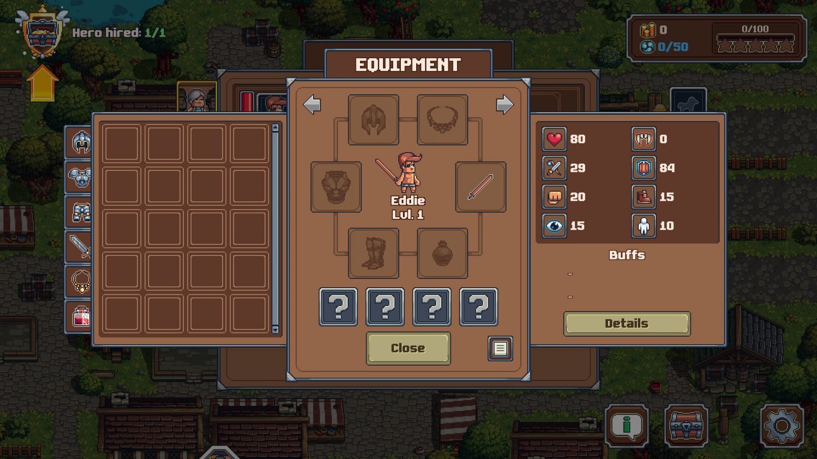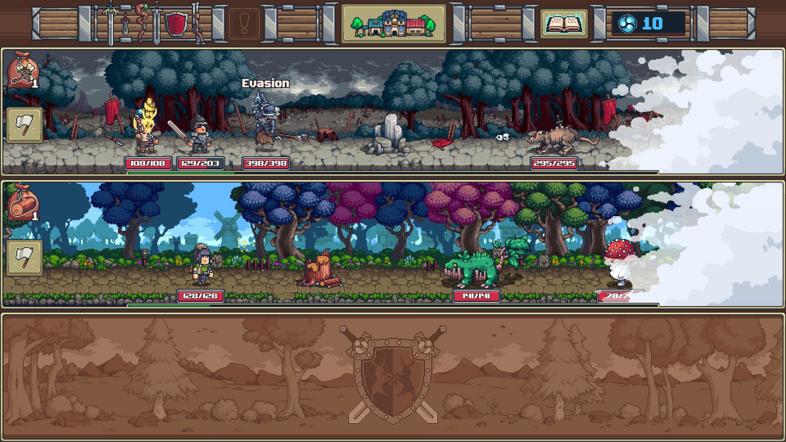 In the beginning, you start with one hero. You don’t get to name him or give him any special stats, and he exists as his own character and you direct him where to go. You can have your hero make new materials, weapons, and armor, which takes time to complete, or you can send them out to explore. Exploring takes time, but there is a danger to it. If your hero falls while exploring, they’ll lose every material they earned on that exploration. That said, they’ll only lose what they got on the exploration, health points which will regenerate, and their mood will be lowered, which can be brought to their satisfaction for cheap at the spa. Their mood impacts their ability to fight and craft materials and it automatically lowers over time. A good enough mood can even give your heroes the chance to attack an enemy twice.