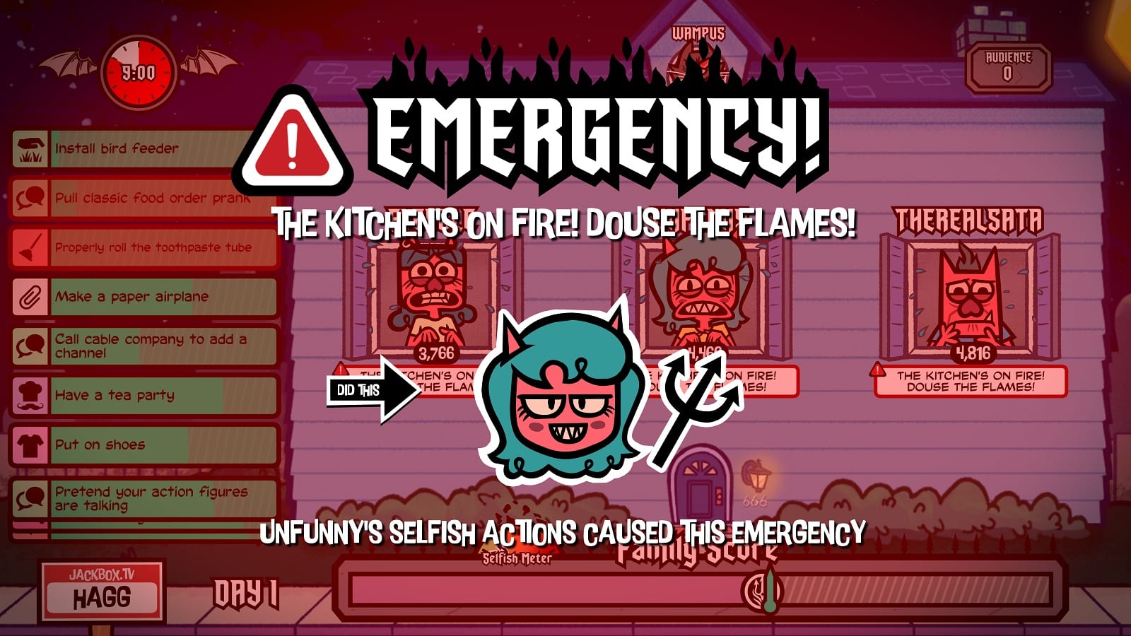The Devils and the Details (3-8 Players) is the most chaotic of the bunch. Each player takes on the role of a member of a family of Demons trying to live a normal human life. While the household has a shared goal for each round to fill up the Family Score and not get sent back to Hell, individually they’re all competing to get the most points. Choosing a household task, such as ordering pizza or driving to the hardware store, will start a minigame on your device to complete by tapping, holding, and swiping. Some tasks may take multiple people to complete, one may need to read directions to another, so players will have to frantically coordinate and help each other. The most points are awarded by selfish actions like watching TV, however if too many people do selfish tasks it will eventually decrease the family score, which needs to pass a certain threshold to progress to the next level. Other players can stop your selfish actions too, so all of this really emphasizes the co-opetition aspect. It’s basically like multiplayer WarioWare and quickly becomes hilariously chaotic with players yelling at each other to help with tasks. While my group may have kept quiet during Blather ‘Round, in this game no one stopped talking. While it is a ton of fun, I would steer people away from playing this with a laptop or other PC, since the gesture controls don’t register very well with a mouse.