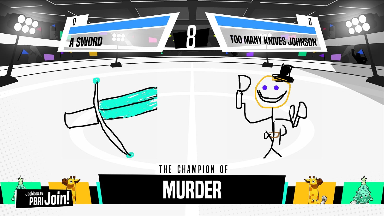 Champ’d Up (3-8 Players) sees combatants drawing their champions, for things like Friday Night and Grandma’s House, and battling other champs for the title. It’s a very strange game, especially if none of the players are artists, and I found it to be the weakest in the package. It may be a lot more fun with more than 3 players, but with only a few people it’s not one I want to go back and play as frequently. It is still hilarious though, and I will never forget the tale of Too Many Knives Johnson, champion of Murder.