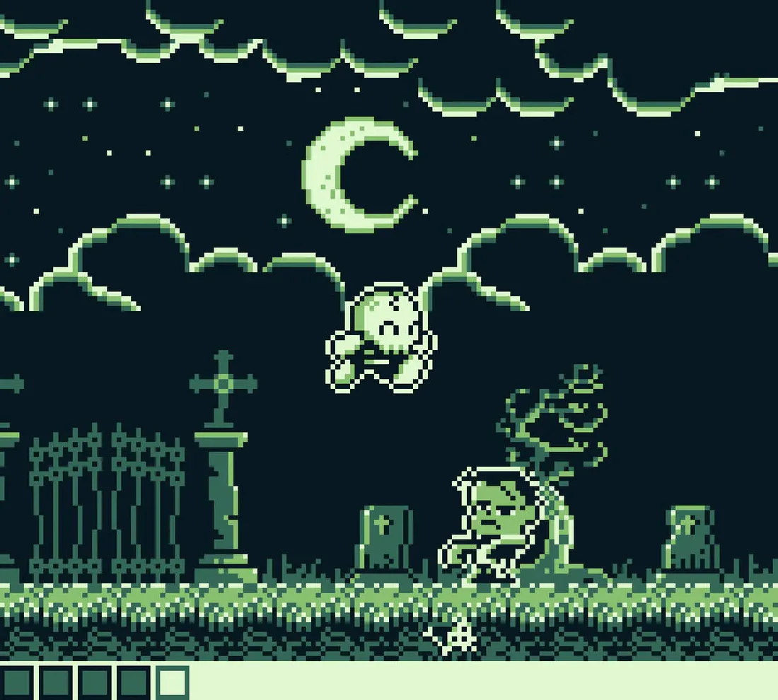 Hermano opens up with a short cutscene where your hermano named Mano is visiting your grave… because you are dead I suppose. He misses you, and in the midst of mourning is carried off by a demonic monster. This summons you, Nano, from your rest, and upon screaming “Hermano!”, you go off on a journey to find and save him. While the story isn’t exactly laid out any more beyond this and the game manual, it’s a cutesy theme that makes for a good foundation.