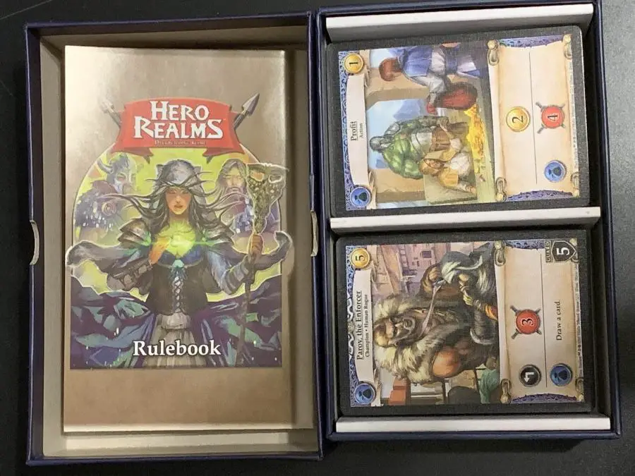 Hero Realms comes in a small box that holds a rulebook and two decks of cards. What you need to know is that this box comes with enough cards to play with 2-4 players and you can expand the game through card packs and expansions.