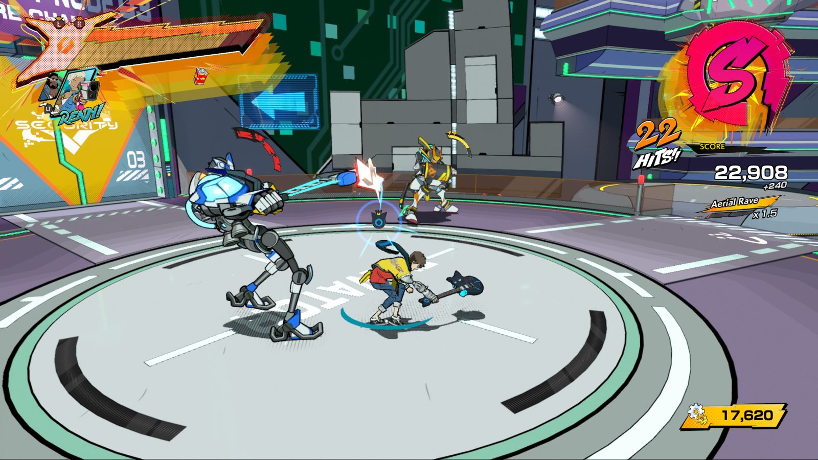 Hi-Fi Rush is otherwise very lenient and freeform when it comes to scoring. Your style meter, called the Rhythm Meter, is constantly depleting and increases a bit when you correctly time moves to the beat and decreases when you get hit by about half a rank. Getting hit or using the same combo too many times will also multiply any more points you gain by 0.8 for a short time, while doing well and doing things like aerial raves or using a special attack (R3 + L3) will add up to a x4 multiplier. It’s not the most punishing system out there, and it doesn’t need to be. It fits the more relaxed, fun vibe the game exudes.