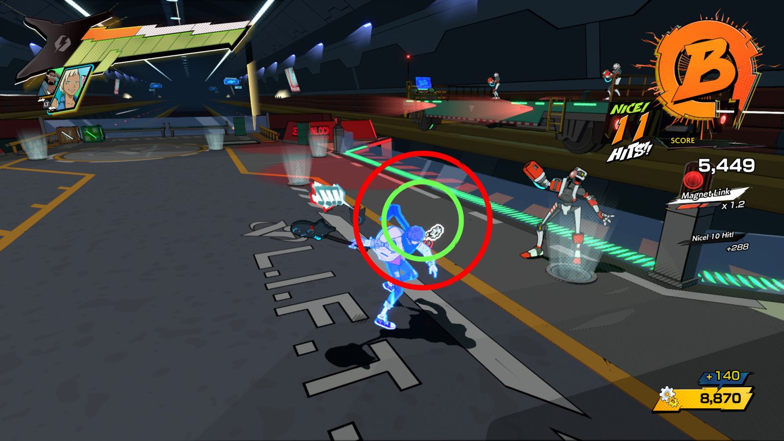 In battle, Chai’s bread and butter are light and heavy attacks with his junk guitar, performed by pressing X and Y respectively. While you can press buttons whenever you want, his attacks will only land on the beat, so being off timing will leave Chai vulnerable as he swings. In addition, while light attacks are immediate, heavies take two beats to come out. You mix and match these two attack types to create a combo, for example a light, light, heavy, heavy will lead into a launcher and aerial combo. Every combo will also end in a big finisher, where you can press either attack button as a circle overlaps with another to deal some serious damage. As you progress through the game, you’ll unlock even more combos for purchase using gears, partners to call in for attacks, finishers, or counters with RT, a grappling hook with LB, and even a parry.