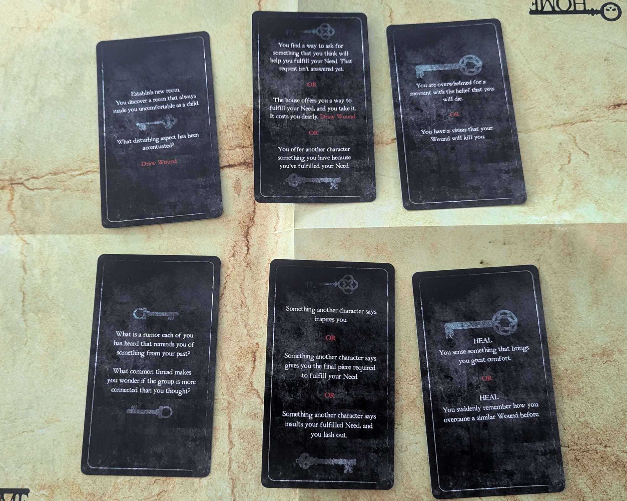 The cards are themed around certain times, such as dusk, midnight, or dawn. As the morning draws near, you will have to determine the fate of your character. Do they escape the house, or are they now a part of it forever? This can be determined by how many wounds your character has or by other factors. Though, as I’ve mentioned, this is a narrative game, and the story being told is determined by the group. My favorite game of Home ended up being about a young man facing his painful childhood, only to come face-to-face with the source of his pain. Home told a shockingly complete story for that character who ultimately escaped the house, leaving his past behind. Others in that group were not so lucky.
