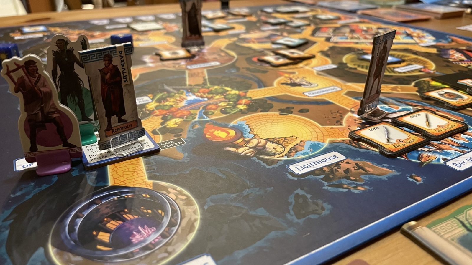 The production value is great. The board is beautiful and vibrant. The card artwork is fantastic and the monster minis have great details. All of the cardboard is good quality and the monster tokens especially are unique and well done. It looks great on the table, is fun to look at, and play with. The monsters included in the game have some noticeable absences. I would expect a hydra and a cyclops at the very least, but a basilisk (the chicken thing, not the snake) and a harpy take their place.