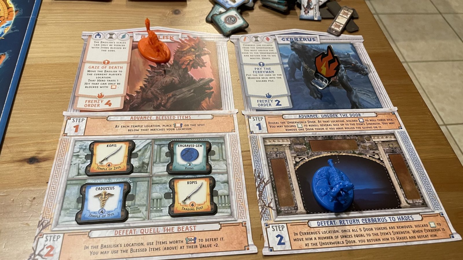 The monsters have a range of difficulties and abilities to keep you on your toes. Boiled down though, you will have to pick up and deliver items to specific locations, roll dice, and bait monsters into traps to defeat them. You’ll do this while worrying about the Legends (civilians) getting gobbled up by the likes of Cerberus or Medusa before you can guide them across the board to their destinations.