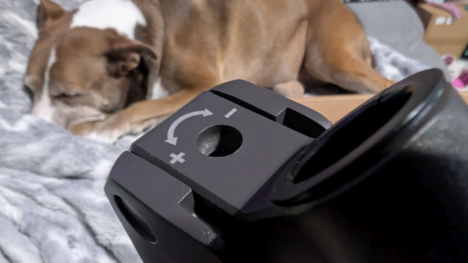 One of the things I appreciated about this model over my previous one was the placement of the tension adjustment. My older model has the tensioner tucked to the side of the arm, whereas this version has it up top with a handy + and – symbol and a rotation arrow to show you exactly how to increase or decrease the tension on the arm.