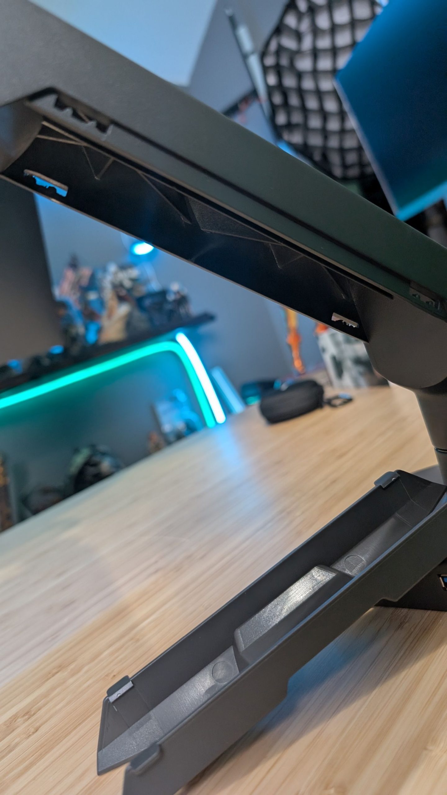 The clamp that holds the mount to the desk for most monitor mounts is a single post in a C-clamp. This model instead employs two attach points inside that same housing, ensuring this thing does not move unless you want it to. Most monitors rely on a set screw and a small tension spring to prevent the arms from moving. This Huanuo model uses some massive double springs to ensure the angle you set is where it stays. Most other mounts have a simple tray that attaches to the bottom, little better than a plastic clip. This Huanuo uses a tray that is tightly integrated with the rest of the arm, giving it a very sleek and clean look if you have a desk with an open back. It’s a lot of simple innovations (or at least they’re making it look simple), and I’m sure it’s cutting deep on manufacturing costs, but the results speak for themselves. The design on this mount is, in a word, flawless.