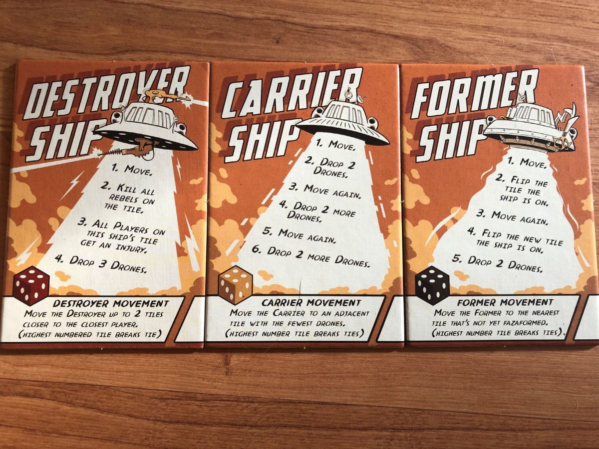 When the enemies activate, Drones attack, removing themselves to deal damage first to Rebels and then the player. You then also add one Drone per space with players. Finally, for each player, you activate one of the Motherships, determined by a tracker, and pass the tracker to the next ship.