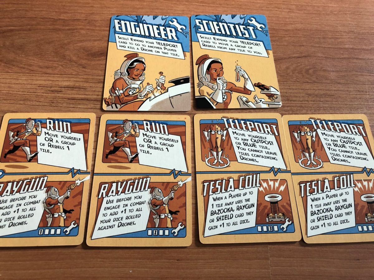 Your team will be beset not only by the Motherships but the Drones they bring as ground troops. For drone combat, you roll a die for each drone on the tile, with a +1 bonus on each die if it matches your character’s area of focus. A roll of 4+ kills a drone, which you keep as currency to purchase Rebels or for certain events. A roll of 3 or lower injures you, flipping your lowest face-up player card to face-down and giving you a different ability. Any Rebels on the tile will take damage for you, expending them. You can heal at outposts, but your character dies and you lose the game if you lose all 4 of your player cards. You can recruit Rebels at outposts, and each map tile has a maximum limit of three Rebels, and it is necessary to expend Rebels to board and damage Motherships, once their locations are cleared of Drones.