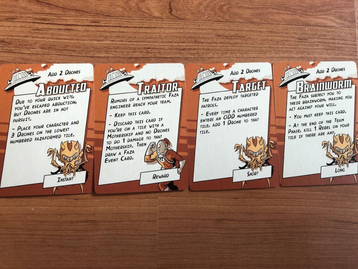 During Mothership combat, they will draw event cards, which can be minor, beneficial, or devastating. These cards inflict effects on the tile where they were drawn as well as across the entire game. You can pay down long term effects with points, forcing you to balance Rebel generation and preparing for future events. Sometimes these events (or the efforts of the Fazaformer Mothership) will terraform squares, causing damage to characters when moving through them.