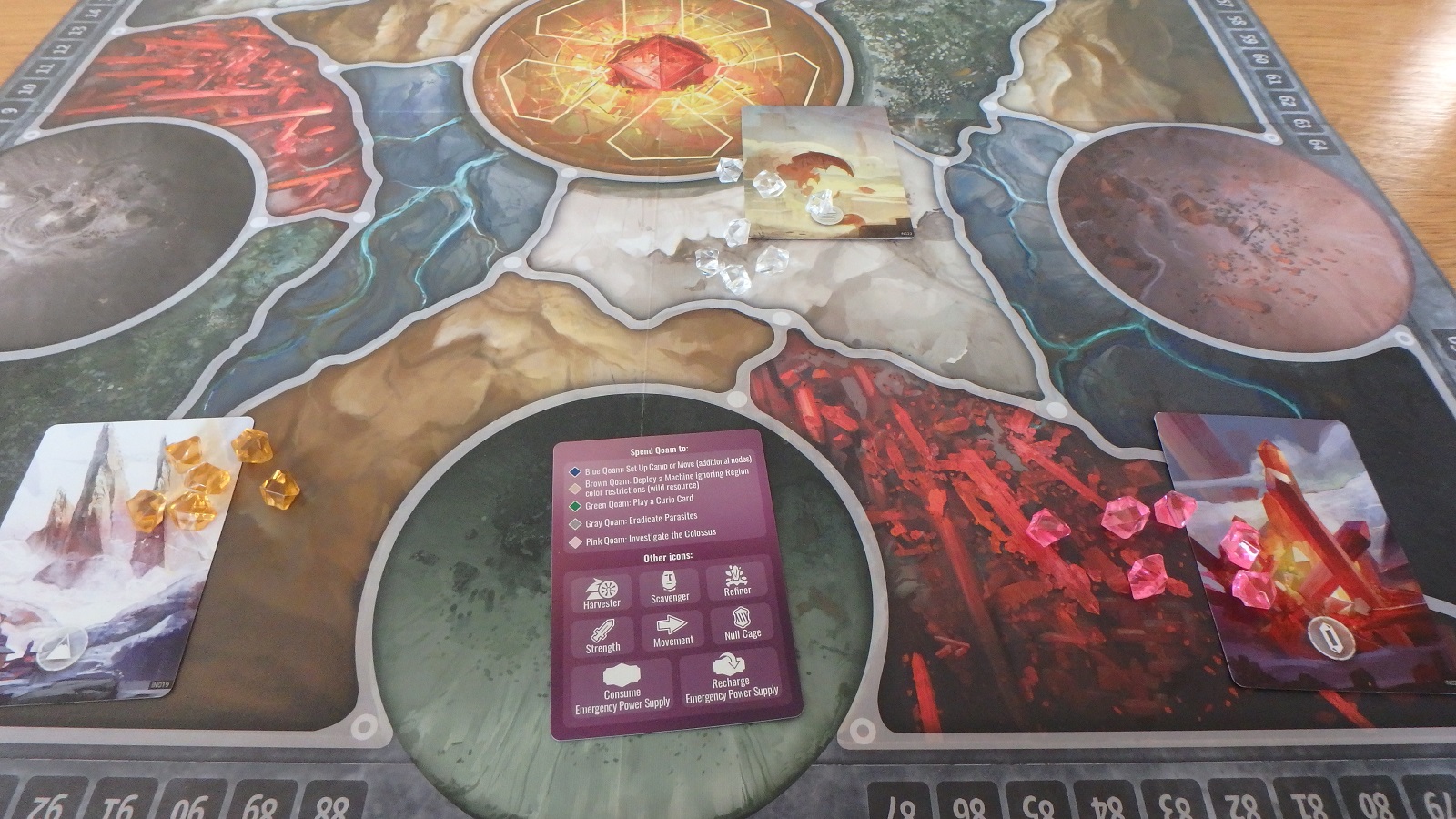 Moving on, Icaion is a long and cumbersome teach. In keeping with most points salad euros, there are a bevy of different actions that players can perform on their turns, and only one is even mildly straightforward. For example, if a player decides to build a machine, they first have to make sure that the machine that they’re building is their first in that region, the furthest left on its row on their player board, and then also that noone has already built a machine of that type in that region. They then spend an amount of crystals equal to the number of machines in that region plus one. These crystals have to be of the region’s color or brown, which are wild for the purposes of building. Then score victory points equal to the number of crystals spent times the number of adjacent like machines, unless there are none, in which case you always score a minimum of the number of crystals spent. Got that? Now repeat that for every one of the games actions, the round and year progression system, and end of game scoring, all of which feature their own minutiae. The worst part of this is that setup for a game with fewer than five players requires everyone to place non-player machines, so you have to make sure that everyone thoroughly understands the game before diving in, since players will be making important decisions before their first action.