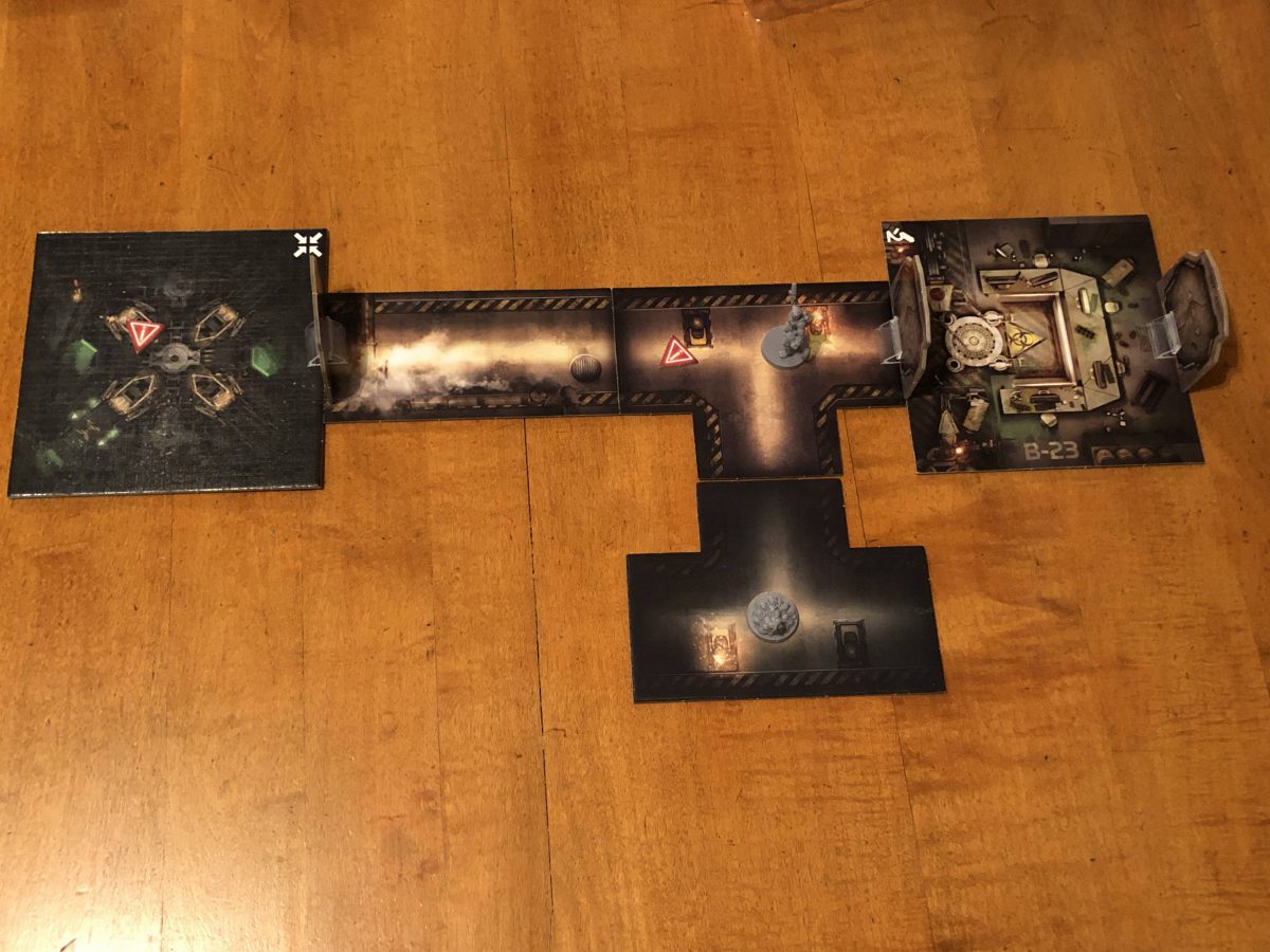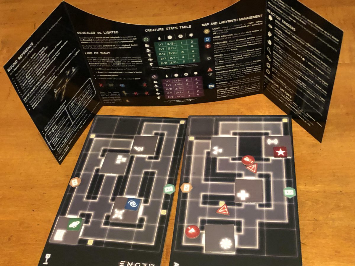 Meanwhile, evil players start to make their plans behind a player screen. Here the scheming begins, with two maps laid out to create a top level and bottom level connected by stairs, reaction card decks are chosen, rooms get assigned, all towards the goal of making the hero’s ability to complete the objectives more difficult. On the map boards two creatures and several danger tokens are placed. Finally, a starting location gets chosen by the evil players and they set out the starting tile in front of the screen with the hero’s figure on top. Now the game begins.
