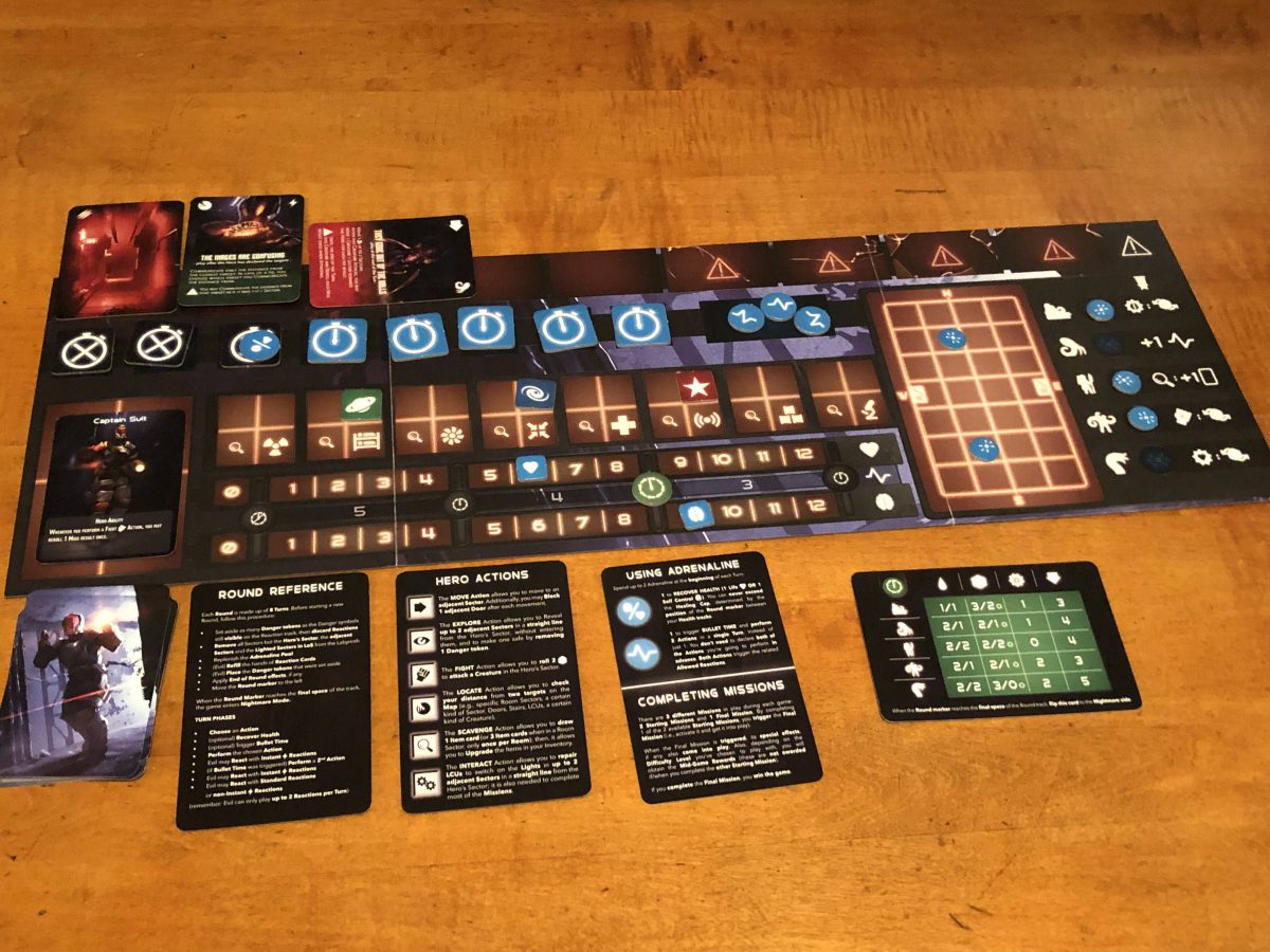 To start, the hero player chooses one of four hero characters with special abilities. Then the hero positions a dashboard with tracks for their life and self control, a grid for placing markers where creatures may be, turn and adrenaline tokens, the current round, and locations where enemy reaction cards will go. An item deck with tools for assisting the hero by causing damage to creatures, giving extra movement, or preventing damage gets drawn from in all but the highest difficulty level. Objective cards coming in blue, green, and red get drawn with the blue or green objective needing to be completed before the red final objective can be activated. The objective cards can also give awards when finished, so it may be advantageous to complete a specific objective to trigger the final objectives. These objectives will always be in different rooms, so the hero will need to traverse large portions of the map.