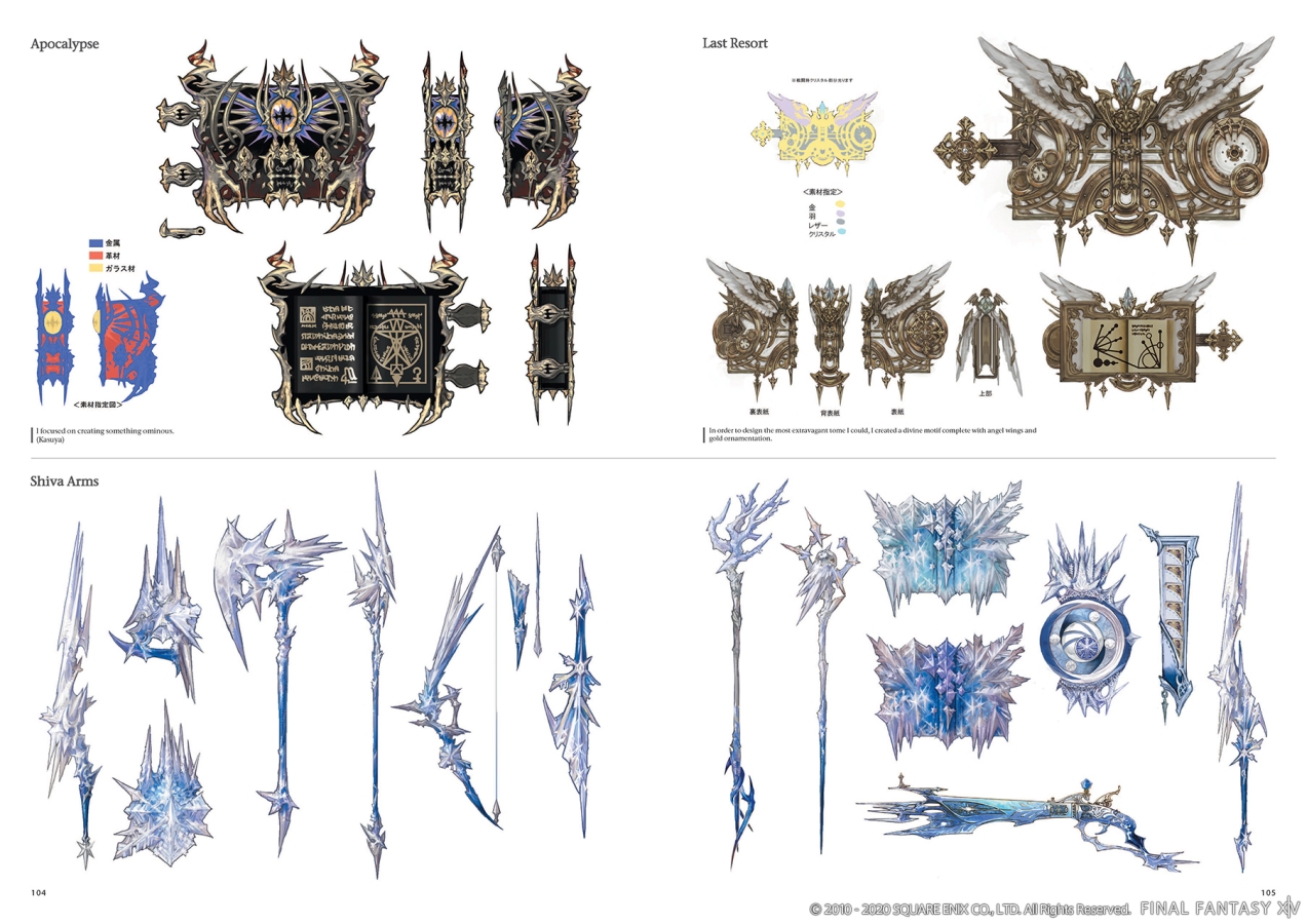 There’s also a lot of gear in this book, everything from Job gear to equipment found in dungeons or crafted. I’ve seen some of these pieces in game and, not to knock the work of the modelers, some of them look great in 2D even if I’m not a fan of how they look in game. For example, the Falconer’s set just looks more interesting on the page.