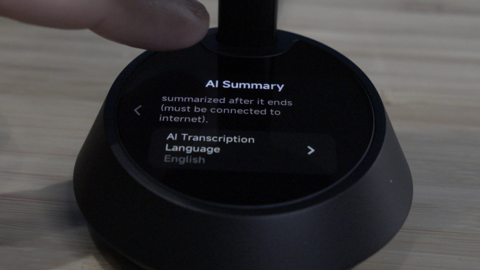 At the bottom of the Wave is a small touchscreen that can tell you what's going on with the device. You can stop and start recording, see the transcription in realtime, adjust volume, mute the call, mute your microphone, turn on transcription and auto-summary, and much more. It’s far more useful than I would have expected, and a welcome improvement over the traditional and more expensive conference phones in the market.