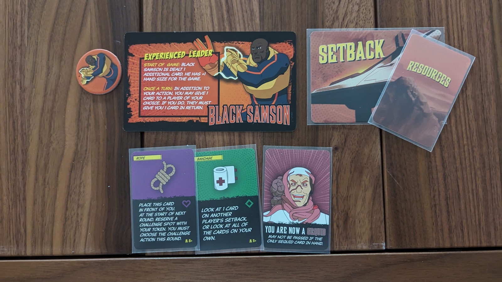I’m going to be brief about my explanation of the game because if you’re familiar with social deduction games, you’ll basically be able to sing along with me. There are two teams: the humans who are trying to complete three challenges or escape on the rocket with only humans, or the Sequids who want to sabotage three challenges or escape on the rocket. Unlike other social deduction games, you won’t be given an allegiance card, instead your allegiance is determined with your resource cards. Hidden in the resource cards are Sequid cards and if you ever acquire one, you are now a Sequid. The game is very specific in that players cannot ever give away their last Sequid card, but if they have more than one they are free to play them onto other players. Players also have a setback card in front of them indicating what two resources they need in order to leave on the rocket. On your turn you can play a card facedown into the challenge, play a card facedown to anyone’s setback, or play a card faceup for its text effect. There is always someone playing as Invincible. Invincible cannot be infected and Invincible is always on the human team.