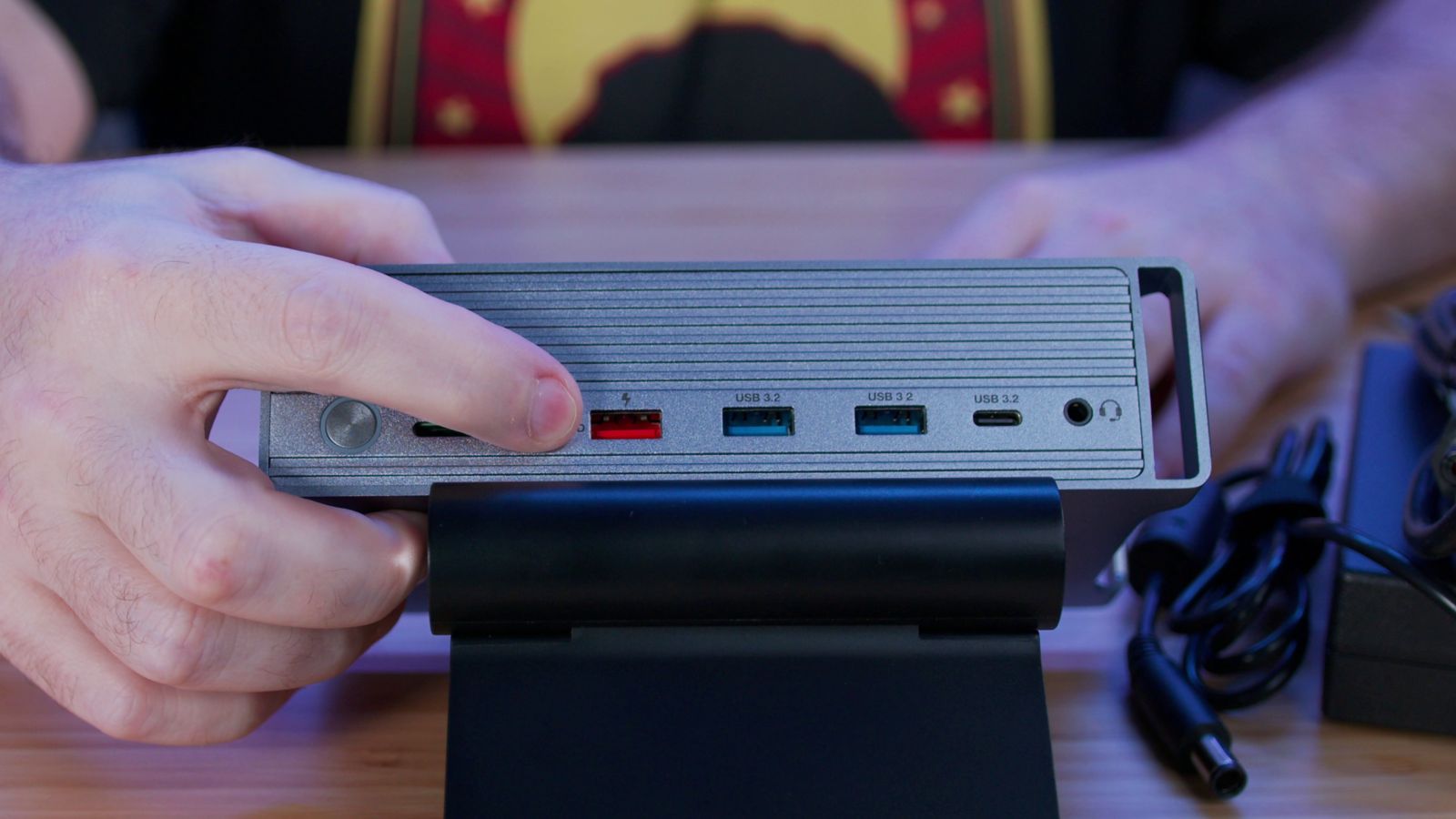 Moving onto the ports on the front of the Dock Pro, you’ll find that IOGEAR didn’t compromise here either. Three USB-A 3.1 Gen 2 ports (also known as USB 3.2 Gen 2 – thanks IEEE for the confusing naming) grace the front panel, each capable of 10gbps simultaneously. Other docks often split the lane between two ports, providing 5gbps to each, and here we have a combined 30gbps of throughput. Next you’ll find a USB-C 3.1 Gen 2 port, which is honestly the only port on this device I was disappointed by – at this price point it should be USB 3.2 Gen 2×2 for 20Gbps of throughput. A single USB-A smart charger port, designated by a red internal color, provides 100W charging to any connected device at 20V/5A. This QC 3.0 port will charge any device while you are using it, with plenty of power to spare. .