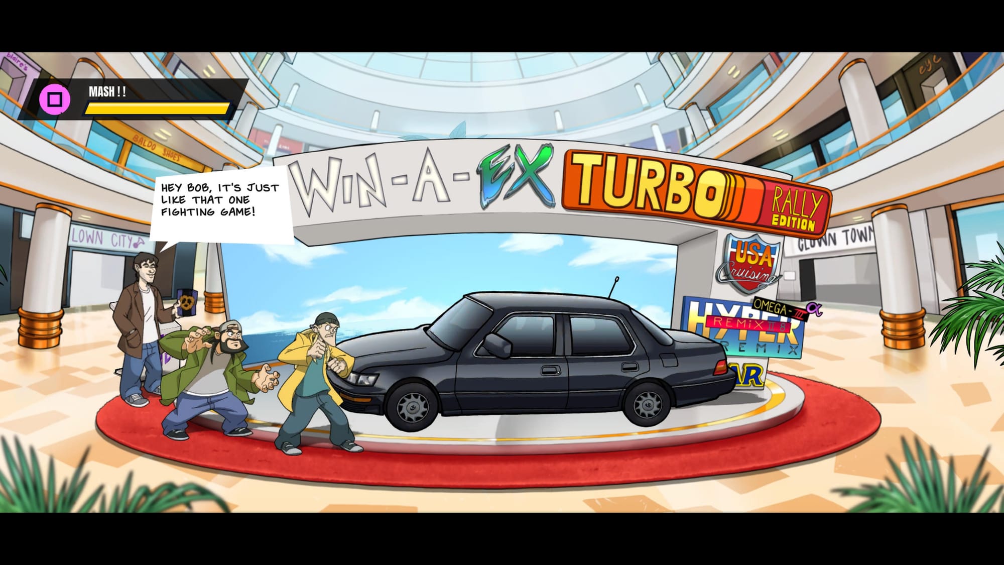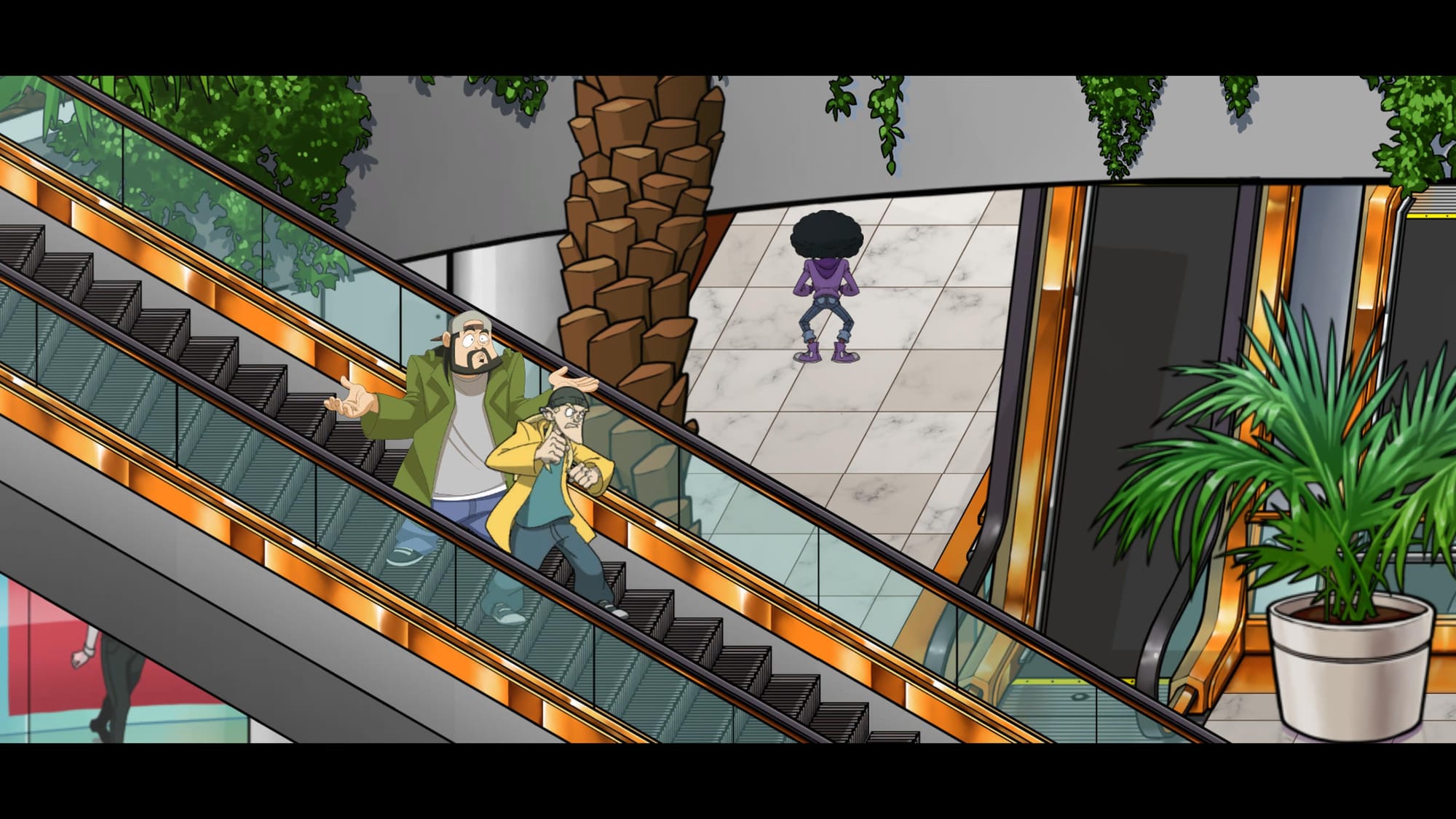 Chronic Blunt Punch wastes no time getting started: our stoner duo hangs outside their favorite Quickstop and, overcome by munchies, decides to stop in the store, only to become entangled in a fight for their lives. They don’t understand why this is happening, or even what’s happening, but they press on, kicking ass through increasingly outlandish set pieces, including a seemingly endless and extremely confusingly laid out mall, in hopes of uncovering who is dead set on ruining their day.