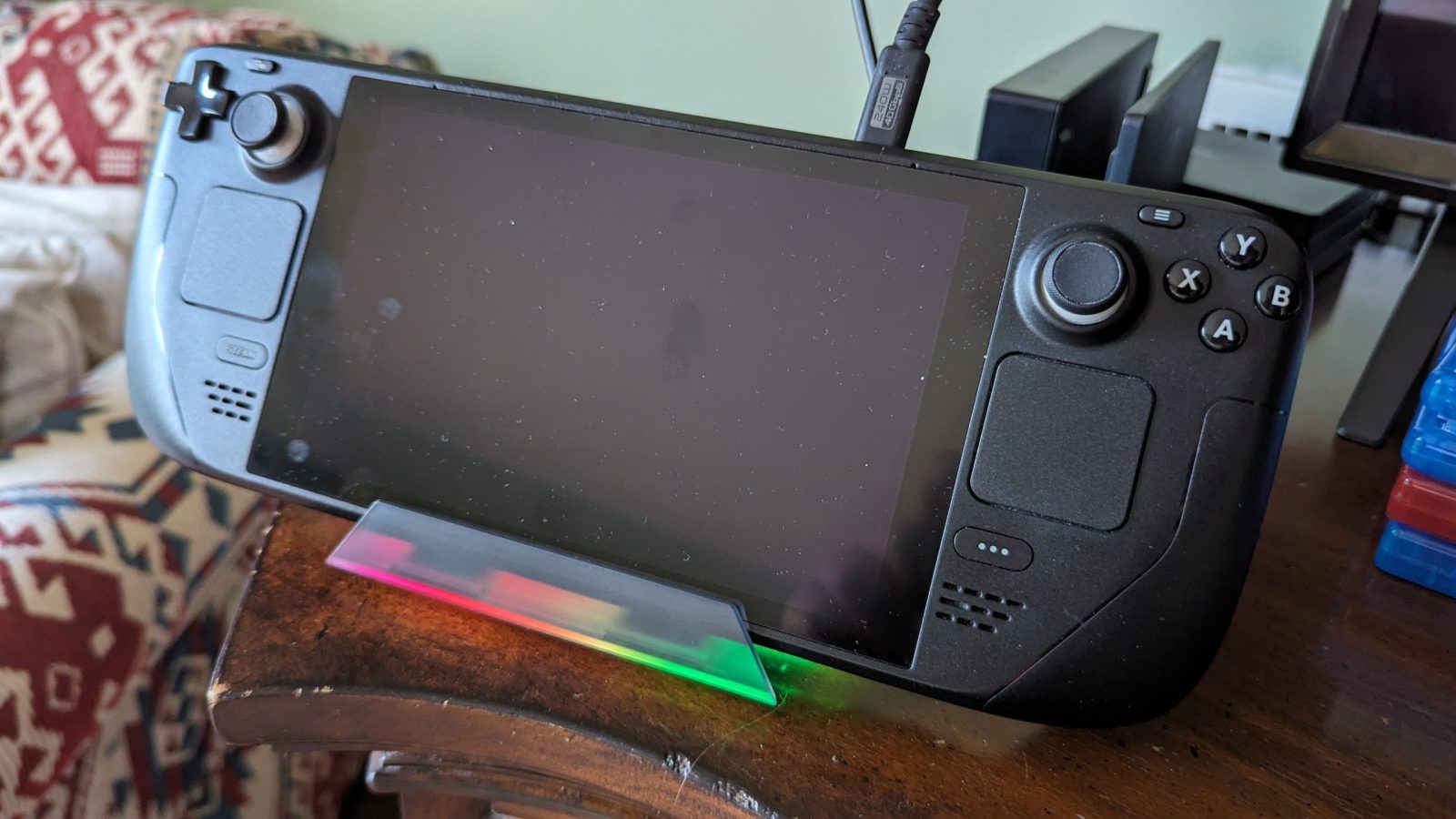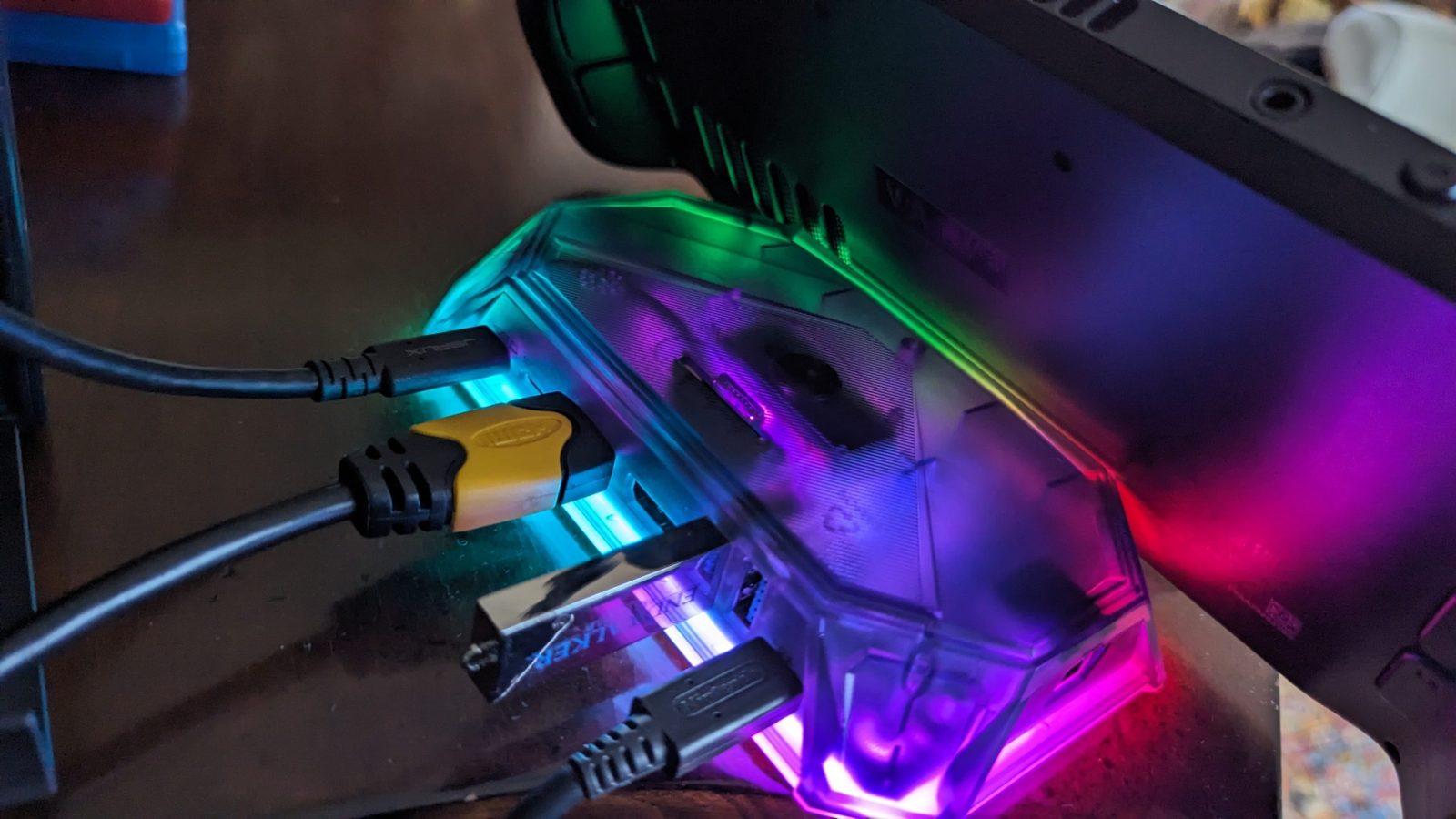 Opening up the box, you’ve got all the usual stuff: the device itself, a short USB-C cable to connect the device and the Deck, and a bunch of warranty and legal jargon. The one thing missing is a manual! Yes, you’re going to have to figure out how everything works here on your own. Most of the ports are labeled with a sticker when you first take the dock out, but there are other features here that could have really used at least a quick start guide. For example, I had to look at the product page’s images to figure out that the button on the front actually slides out, revealing a shelf for your handheld to sit on. It’s also not entirely obvious how to turn off the RGB, as you press in on the top of the device in a very specific spot rather than a traditional button.