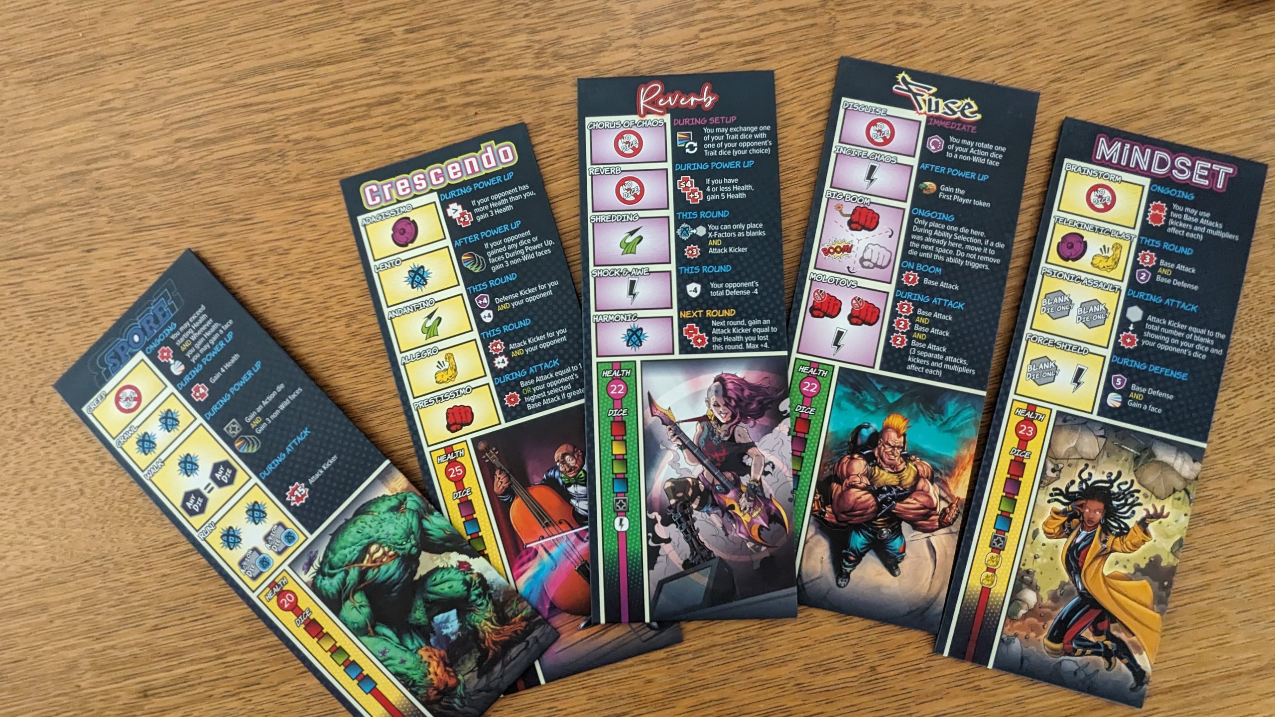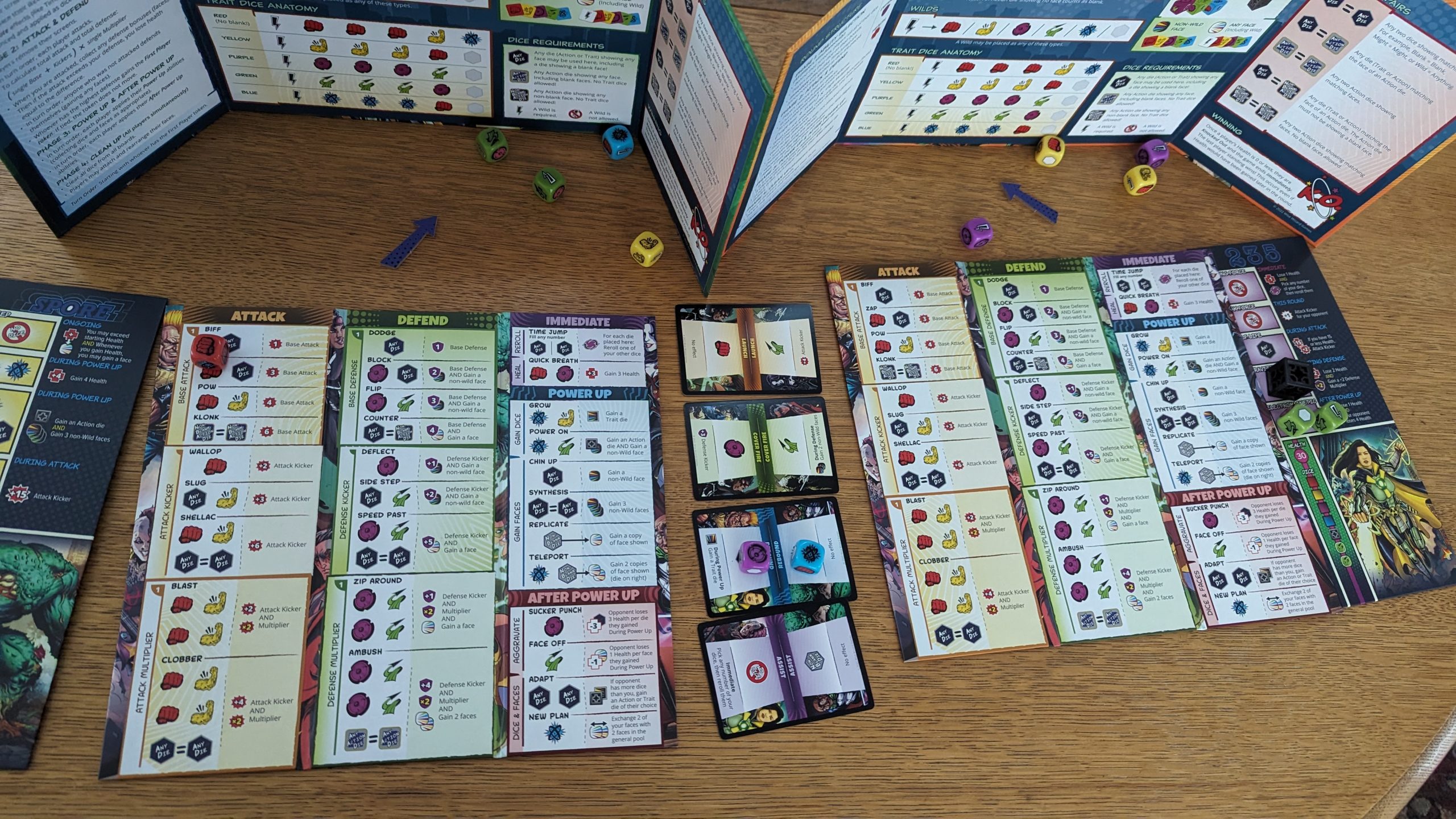 Here it is, the long-awaited follow-up to my Kapow! Volume 1 review, the review for the aptly named standalone expansion Kapow! Volume 2. So what’s in a box? All the dice, faces, boards, and screens to play the game again, along with six new characters and components to play the 4-player team game. So let’s talk about the team game right quick before I get into the meat and potatoes of my review: each player picks their character, both teams add their characters’ health totals into one super dial for each team, and get 4 team-up cards apiece. Teammates sit next to each other and coordinate their planning phases which are mostly unchanged with the exception of the team-up cards, which function as extra places that require a die from each teammate. Players now also have to decide which of their two opponents they’re targeting with their attacks. Each player’s board, dice, and faces are all separate, but the health is fused, which feels strange to me. Yeah, it’s a duel game adapted to play four, but you’re not constantly reminded of it like in games like Rebellion or War of the Ring; it’s a quality game mode. The real killer here is that playing the four player game requires mixing the dice and faces from both boxes, and separating them both out again to play twos. I only played Kapow! At four players for review, so it’s just a matter of it not being worth the hassle for me, but hey, the guessing game of who’s attacking who is another layer of what I loved from my original review, so it may be for you.