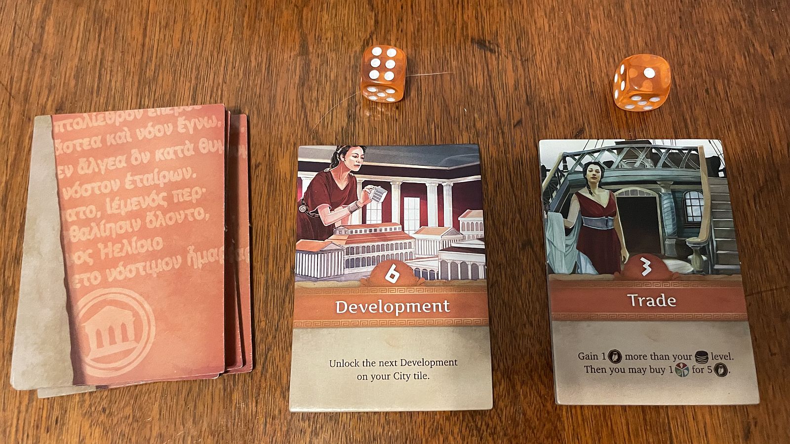 In Khora, each player will be assigned a Polis (basically a city) with a tiny bit of asymmetry to give you a guiding push but not so much that it impacts the game beyond that. The core mechanic revolves around rolling a set of dice that determine what actions you can do on your turn. Every player has the same actions available to them and they are numbered 1-6. Everyone simultaneously rolls their two dice (you can unlock a 3rd in game) and secretly picks what two actions they will do. The catch is that actions you pick have to be equal to or less than your dice values, with the better actions being the higher values.