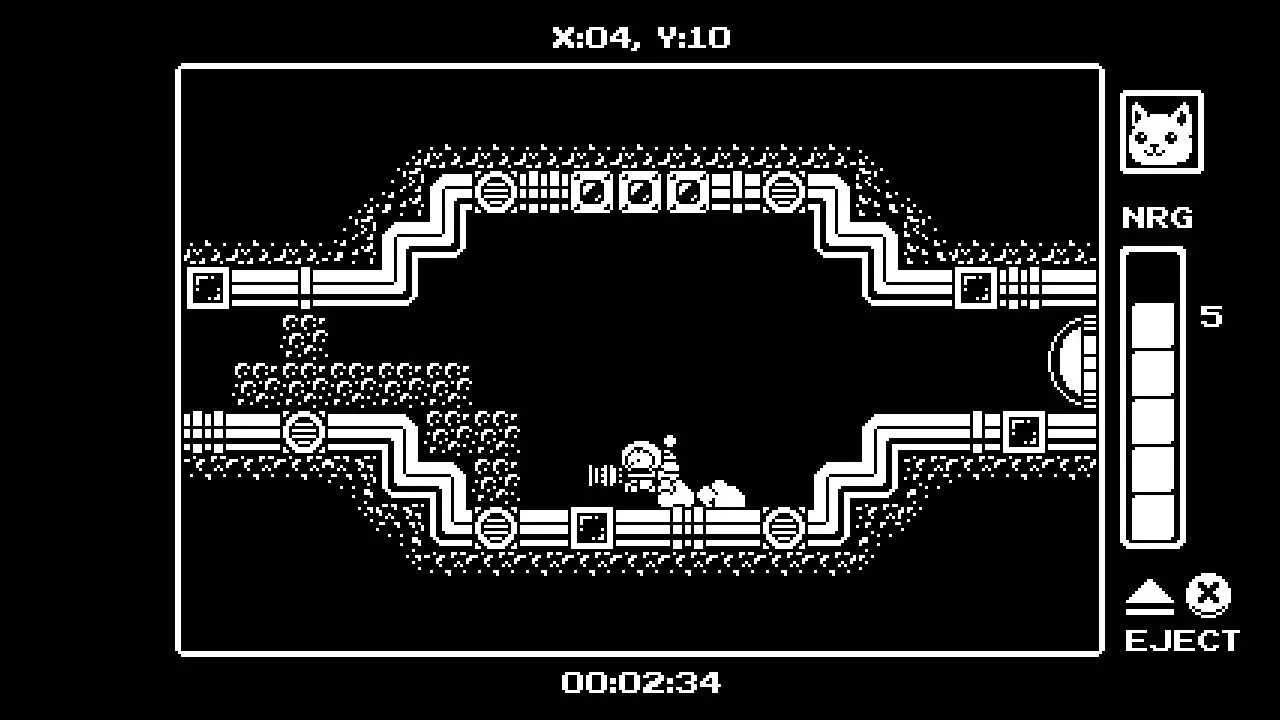 In Gato Roboto, you play as Kiki, a cat that accidentally crash landed her master Gary’s spaceship onto a strange planet. As Gary is injured, it’s up to you to pilot a Mechsuit and traverse the expanding area in order to make heads and tails of the situation. During your playthrough, you’ll also encounter a mysterious rat that stands between you and sweet freedom. It’s a story that doesn’t really do much, but there’s enough that it’s serviceable; in between areas are logs that you can view that tell of people who have either left or perished in this place.