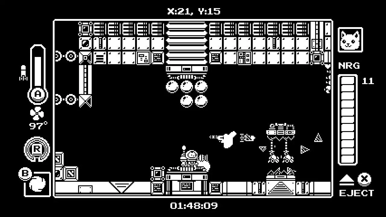 While finding upgrades is going to take priority (especially vital ones like a double spin jump ala Sonic or a dash move that makes you invulnerable for a short time), you can also collect cassettes that will grant you different color palettes or even more powerful shot types for your main peashooter. The cassettes highlight the minimal yet aesthetically pleasing pixelated style of Gato Roboto. Compared to games like Minit or Downwell, this game has the 1-bit black-and-white color scheme, which makes for a simple style to read enemy attacks and get an easy view of the terrain. I did enjoy the graphics for being a nice little throwback to the pixelated classics.